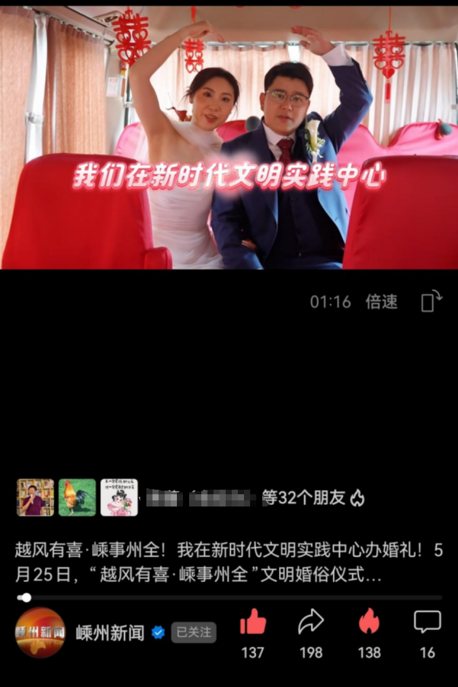 嵊州市創(chuàng)新推出“越風(fēng)有喜·嵊事州全”文明婚禮項(xiàng)目,讓新時(shí)代婚禮既有文化底蘊(yùn)又顯文明新風(fēng)。該項(xiàng)目依托全市新時(shí)代文明實(shí)踐中心資源,巧妙融合越劇之鄉(xiāng)的非遺特色與現(xiàn)代婚慶禮儀,推出首批7項(xiàng)特色服務(wù)和6大主題場(chǎng)景,倡導(dǎo)“簡(jiǎn)約不簡(jiǎn)單、節(jié)儉更精彩”的婚禮新風(fēng)尚。