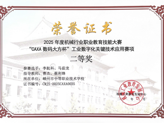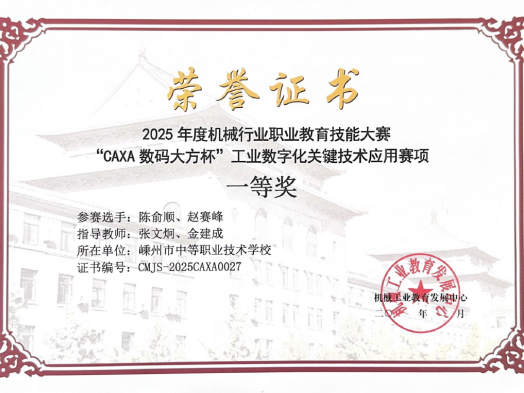 6月25日至29日,由機(jī)械工業(yè)教育發(fā)展中心主辦的2025年度機(jī)械行業(yè)職業(yè)教育技能大賽“CAXA數(shù)碼大方杯”工業(yè)數(shù)字化關(guān)鍵技術(shù)應(yīng)用賽項(xiàng)在青島職業(yè)技術(shù)學(xué)院隆重舉行。其中,嵊州市中等職業(yè)技術(shù)學(xué)校取得了一等獎和二等獎的好成績!
