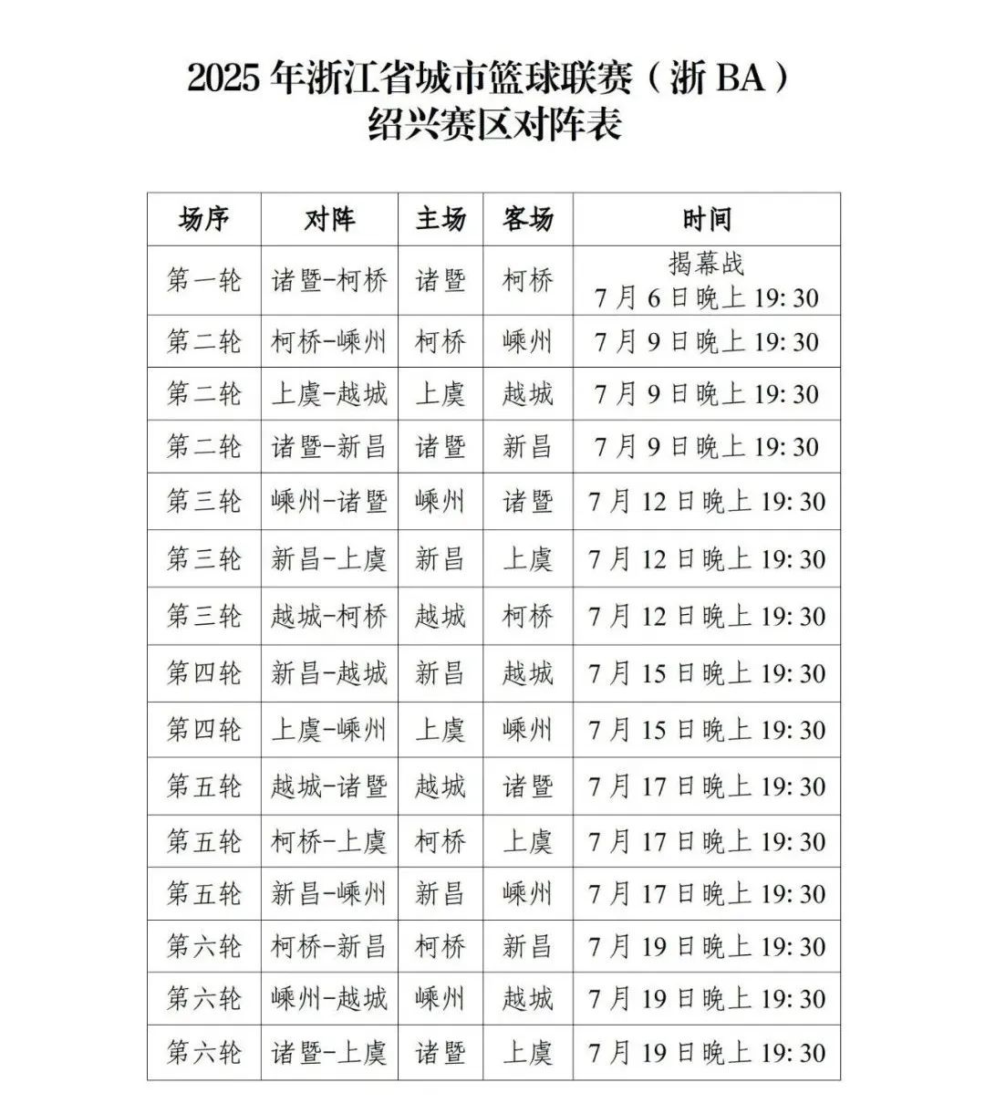 浙江省籃球聯(lián)賽(簡稱“浙BA”)是全省規(guī)模最大、檔次最高的群眾籃球賽事,將于2025年7月至2026年2月在全省各地舉行。全省11個(gè)地級市、90個(gè)區(qū)、縣(市)均將出戰(zhàn)。紹興賽區(qū)預(yù)選賽將于2025年7月6日至7月19日在各區(qū)、縣(市)開戰(zhàn)。