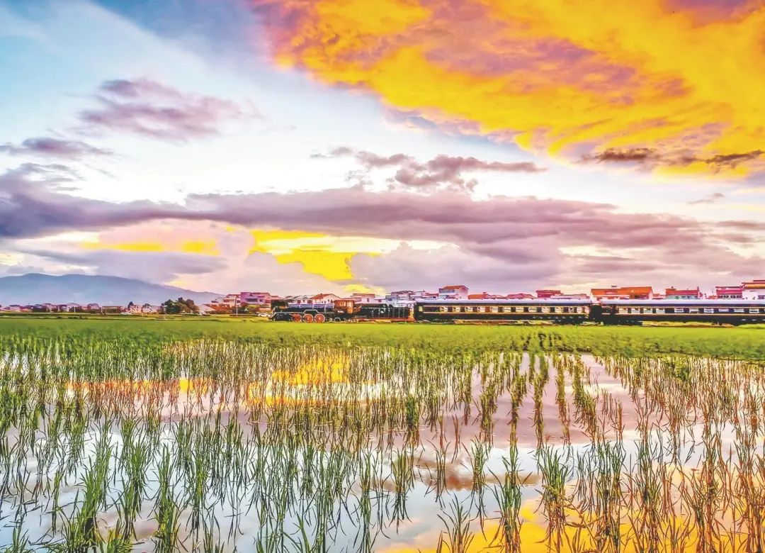 在嵊州市甘霖鎮(zhèn)的水稻良種場,一列經(jīng)過改裝的綠皮火車在絢爛晚霞映照下成為一道亮麗的風(fēng)景線。