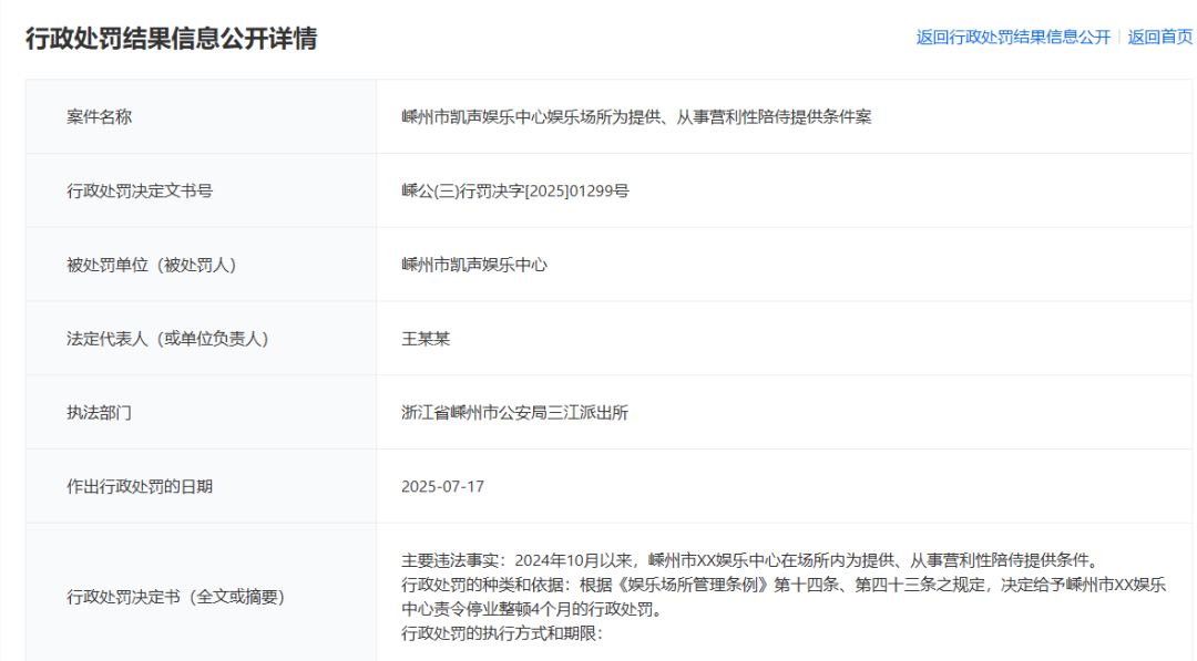 主要違法事實:2024年10月以來,嵊州市一娛樂中心在場所內(nèi)為提供、從事營利性陪侍提供條件。