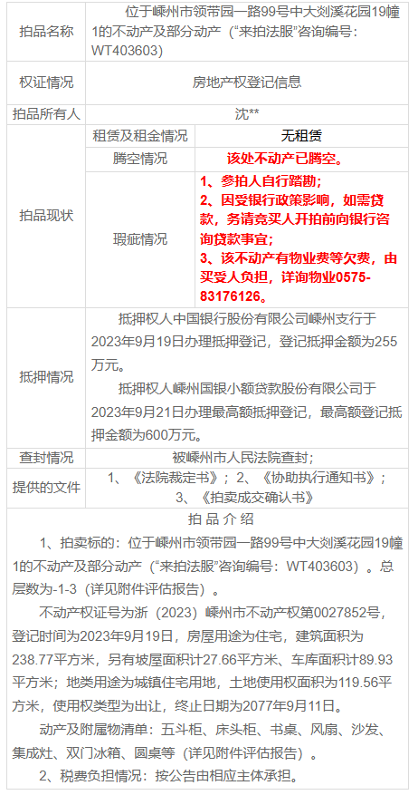 一、拍賣(mài)標(biāo)的:位于嵊州市領(lǐng)帶園一路99號(hào)中大剡溪花園19幢1的不動(dòng)產(chǎn)及部分動(dòng)產(chǎn)(“來(lái)拍法服”咨詢編號(hào):WT403603)。總層數(shù)為-1-3。