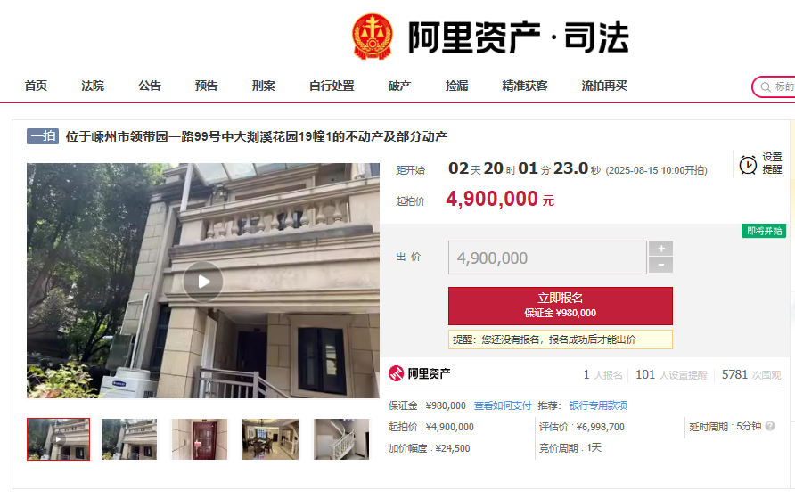 浙江省嵊州市人民法院將于2025年8月15日10時(shí)至2025年8月16日10時(shí)止(延時(shí)的除外)在阿里巴巴司法拍賣(mài)網(wǎng)絡(luò)平臺(tái)上進(jìn)行公開(kāi)拍賣(mài)活動(dòng)(法院賬戶名:嵊州市人民法院,法院主頁(yè)網(wǎng)址: