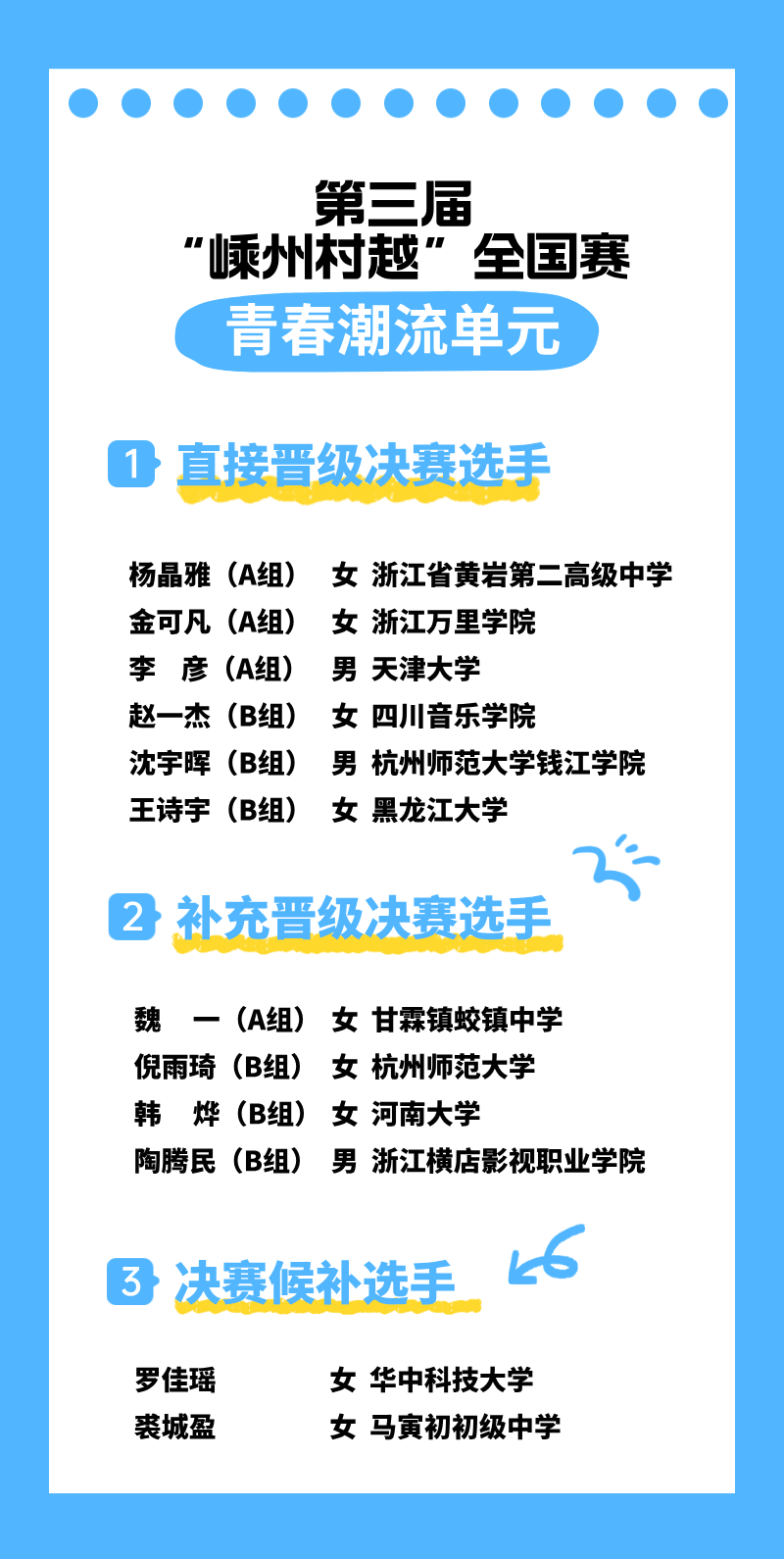 8月11-12日,第三屆鄉(xiāng)村越劇聯(lián)賽(嵊州村越)全國(guó)賽青春潮流單元復(fù)賽在越劇誕生地一一浙江嵊州成功舉行,晉級(jí)決賽的10名選手和2名決賽候補(bǔ)選手名單已經(jīng)揭曉!