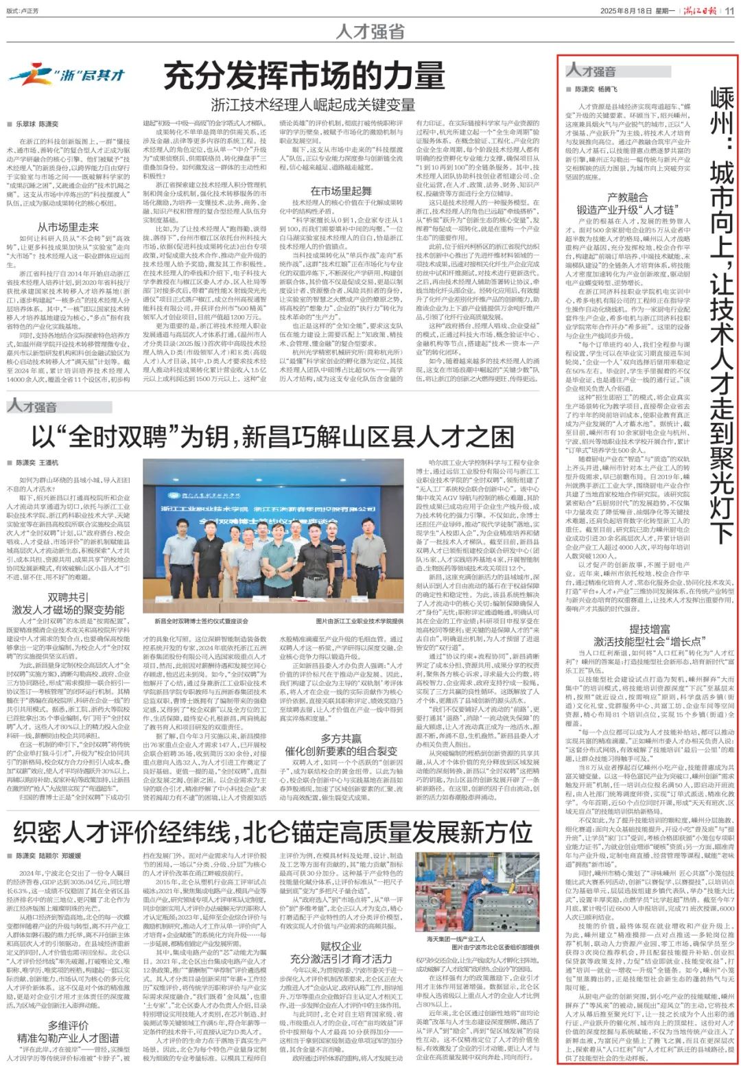 8月18日,《浙江日?qǐng)?bào)》刊發(fā)《嵊州:城市向上,讓技術(shù)人才走到聚光燈下》文章,報(bào)道嵊州市人才工作相關(guān)經(jīng)驗(yàn)做法。