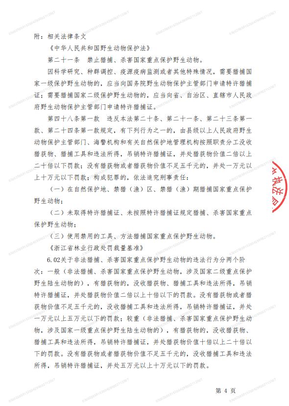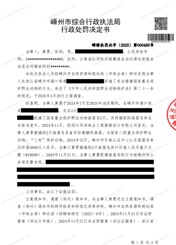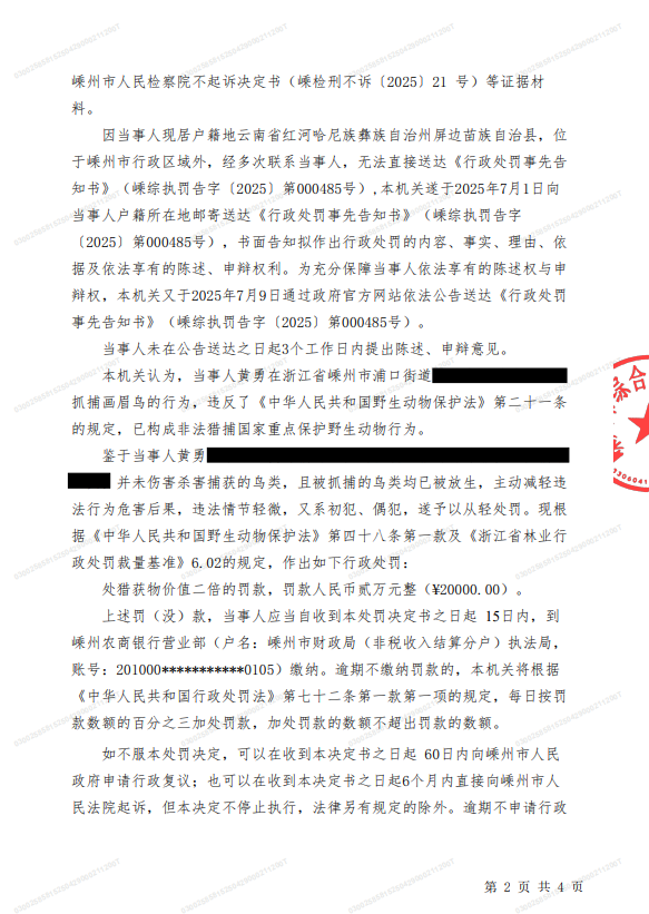 因你(單位)抓捕畫眉鳥的行為違反了《中華人民共和國野生動物保護(hù)法》第二十一條之規(guī)定,屬非法獵捕國家重點(diǎn)保護(hù)野生動物的行為。根據(jù)《中華人民共和國野生動物保護(hù)法》第四十八條第一款及《浙江省林業(yè)行政處罰裁量基準(zhǔn)》6.02之規(guī)定,本機(jī)關(guān)對你(單位)作出了如下行政處罰決定:處獵獲物價值二倍的罰款,罰款人民幣貳萬元整(¥20000.00)。
