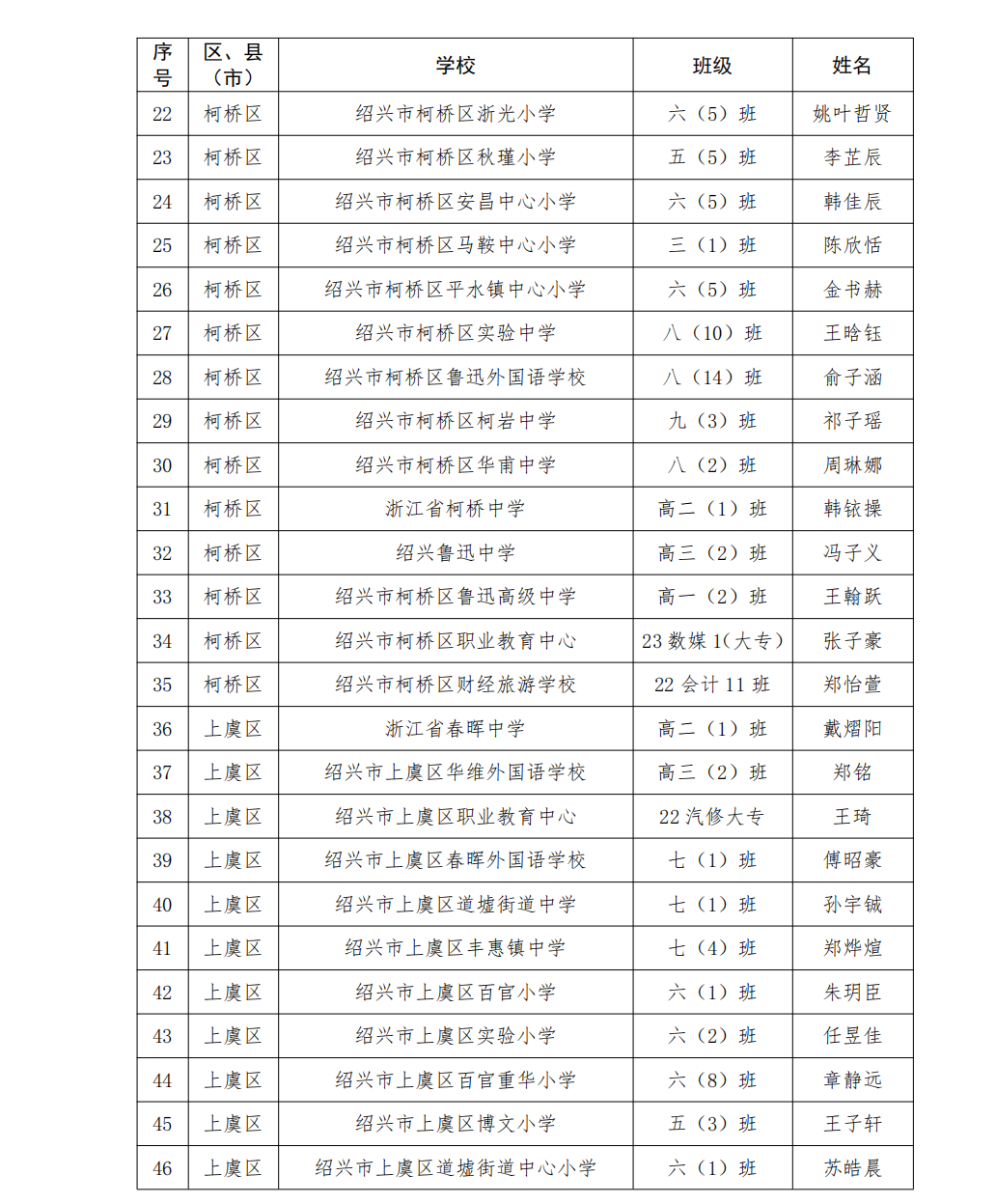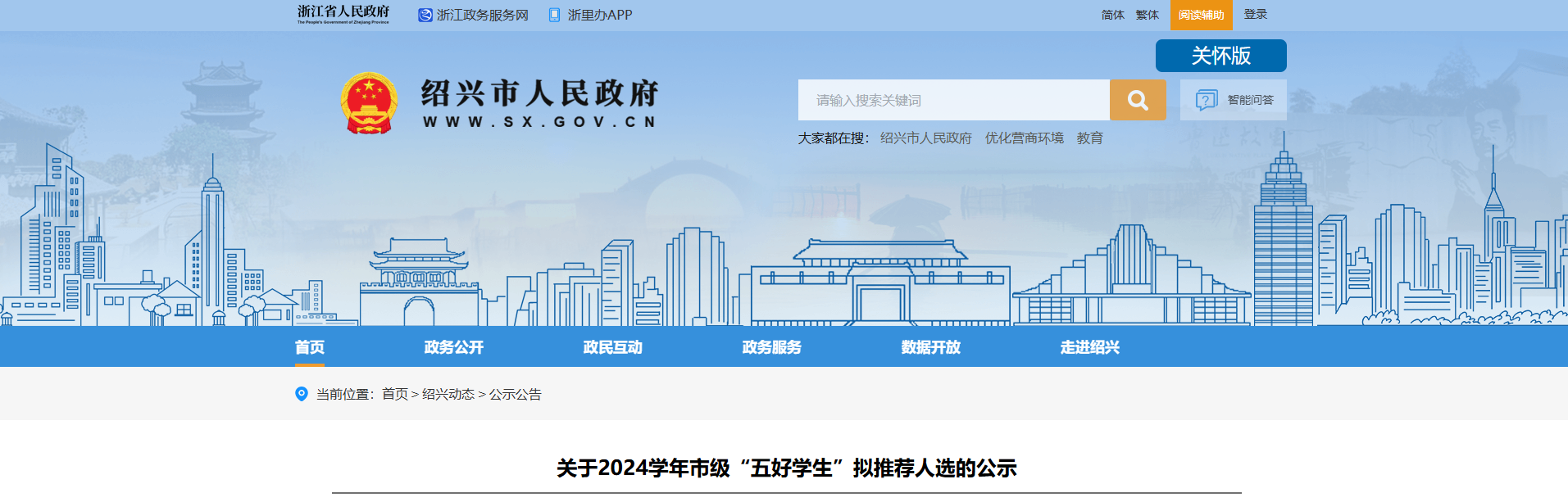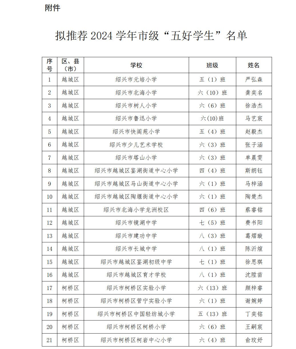 根據(jù)《紹興市“五好學生”評價指導性意見》(紹市教〔2022〕47號)和《紹興市教育局關于推薦2024學年市級“五好學生”的通知》相關要求,現(xiàn)對2024學年市級“五好學生”擬推薦人選予以公示,公示時間為8月20日至8月26日。