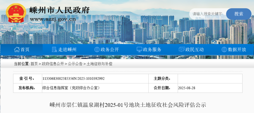 為切實履行公眾參與、信息公開程序,更好地做好社會風(fēng)險評估工作,根據(jù)《中共浙江省委辦公廳 浙江省人民政府辦公廳關(guān)于印發(fā)<浙江省重大決策社會風(fēng)險評估實施辦法>的通知》(浙委辦發(fā)[2019]53號)、《中共紹興市委辦公室紹興市人民政府辦公室關(guān)于印發(fā)<紹興市重大決策社會風(fēng)險評估實施細則>的通知》(紹市委辦發(fā)[2020]1號)及《嵊州市重大決策社會風(fēng)險評估實施細則》(嵊市委辦發(fā)〔2020〕17號)文件要求,對該項目進行社會風(fēng)險評估公示,廣泛征求公眾意見?,F(xiàn)將嵊州市崇仁鎮(zhèn)溫泉湖村2025-01號地塊土地征收的有關(guān)情況公示如下: