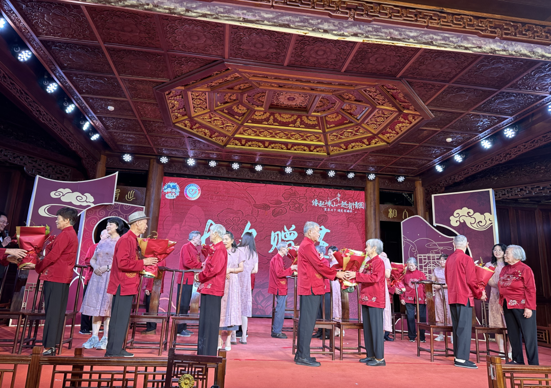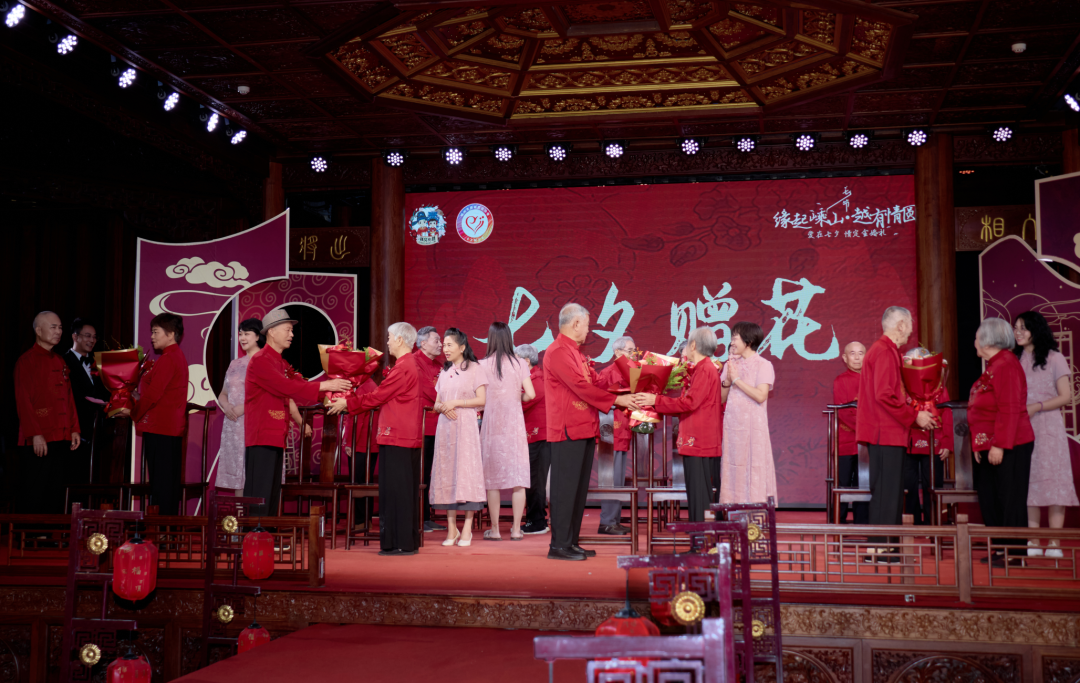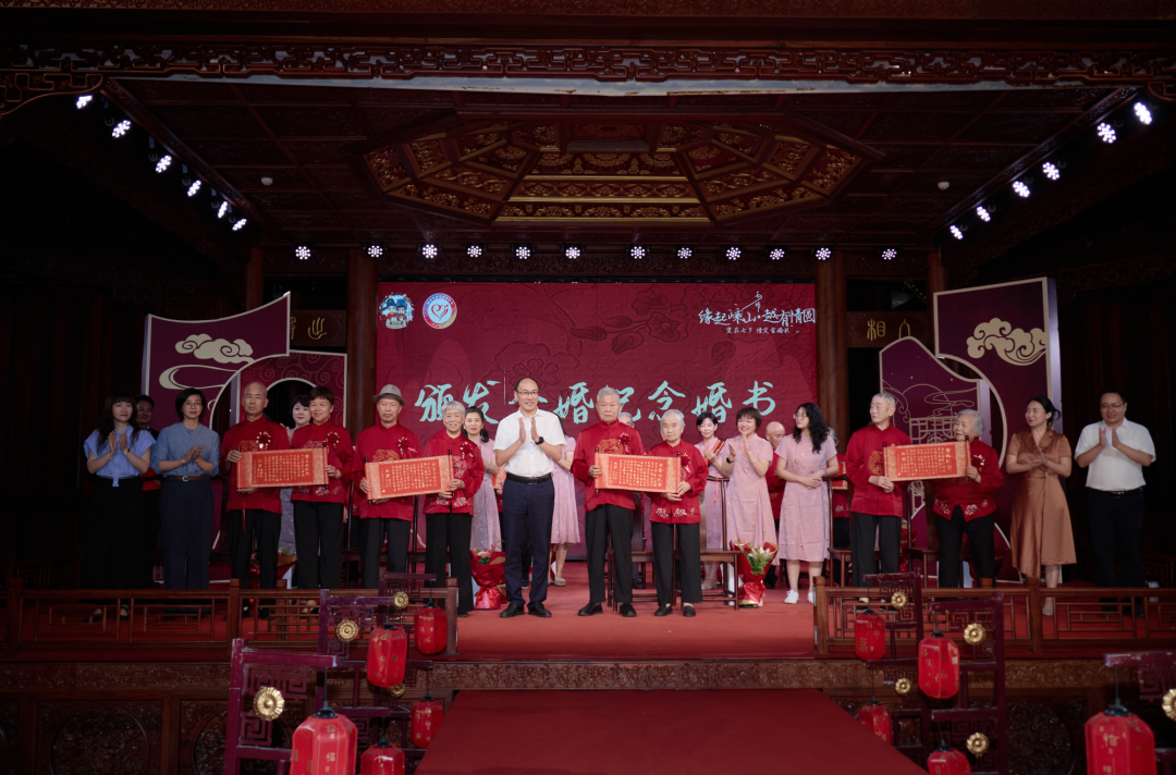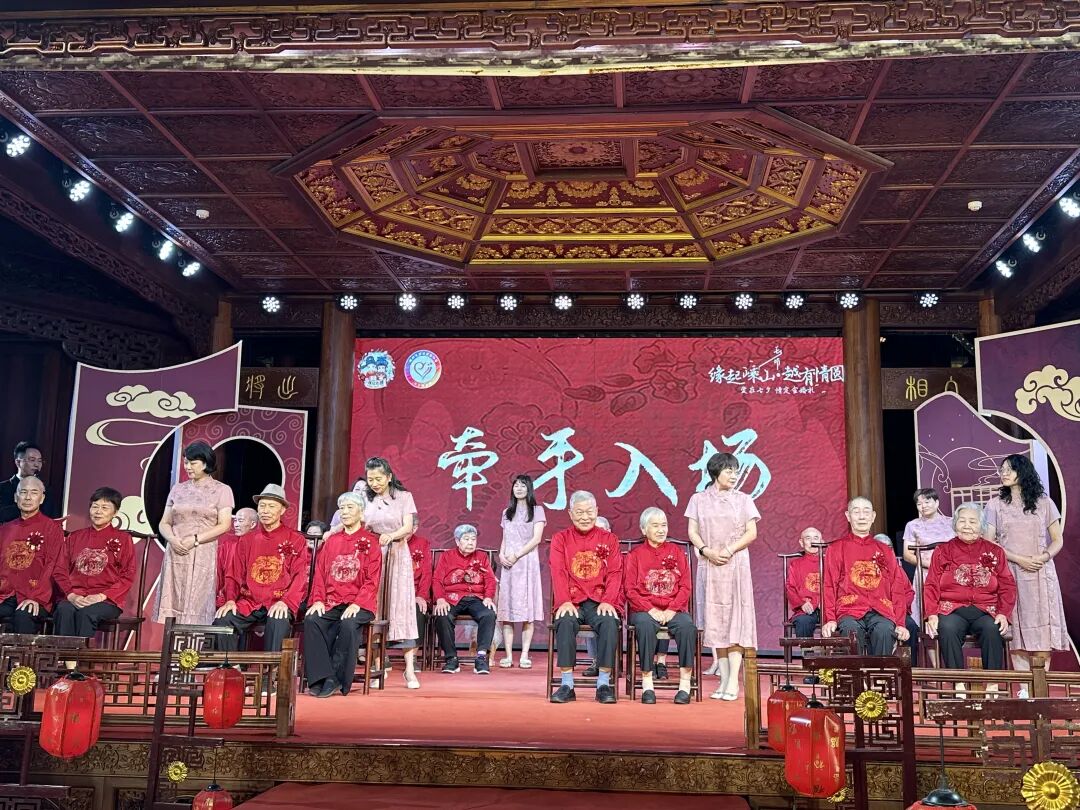 這場活動(dòng)在古色古香、喜慶溫馨的越劇小鎮(zhèn)古戲樓里舉行,由嵊州市委宣傳部、嵊州市民政局、嵊州市婦聯(lián)、嵊州市供銷合作社主辦,嵊州市婚姻家庭協(xié)會(huì)承辦。8對(duì)平均年齡82歲、最長婚齡達(dá)71周年的老夫妻們,身著紅色中式婚禮服攜手走上舞臺(tái),流程簡約而不失隆重,他們?cè)诂F(xiàn)場親朋好友與鄉(xiāng)親鄰里的美好見證下,圓夢(mèng)一場遲到數(shù)十年的婚禮。
