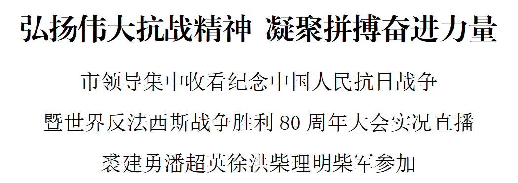 市委書記裘建勇,市委副書記、市長(zhǎng)潘超英,市人大常委會(huì)主任徐洪,市政協(xié)主席柴理明,市委副書記柴軍等副市級(jí)以上領(lǐng)導(dǎo)在市行政中心會(huì)議室集中收看紀(jì)念中國(guó)人民抗日戰(zhàn)爭(zhēng)暨世界反法西斯戰(zhàn)爭(zhēng)勝利80周年大會(huì)實(shí)況直播。