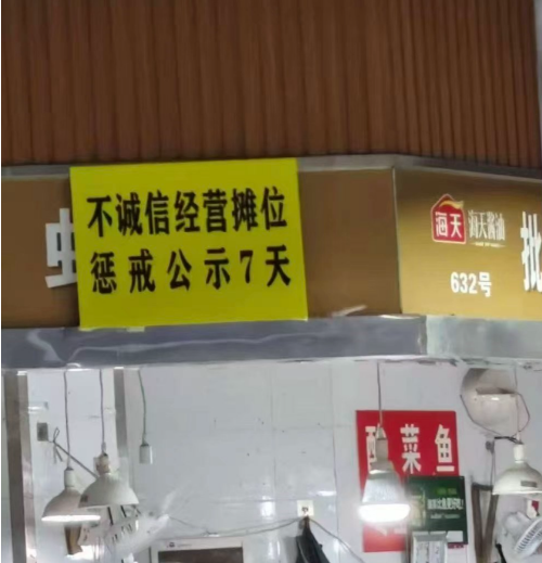 上午,記者來到嵊州市江濱市場,看到在水產(chǎn)區(qū)一家水產(chǎn)店招牌上,掛著一張長約1米、寬約0.6米的黃牌,上面寫著“不誠信經(jīng)營攤位 懲戒公示7天”,由于這家店位于三岔口,黃牌特別顯目。