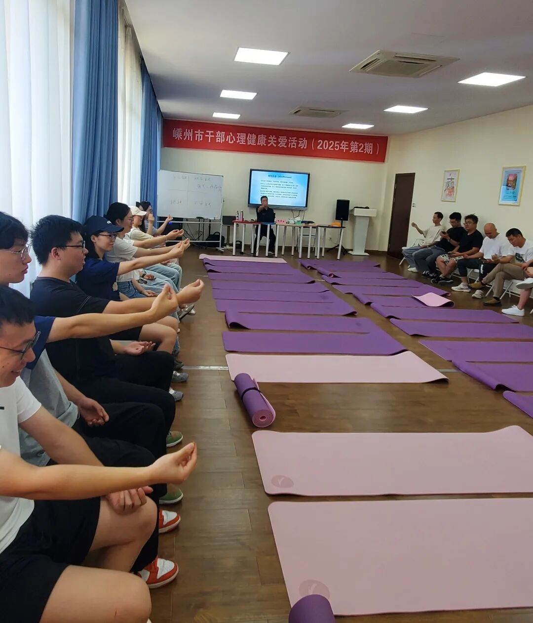 首先老師介紹了正念相關(guān)知識(shí),接著學(xué)員們?cè)诶蠋煹闹笇?dǎo)下進(jìn)行正念練習(xí),通過(guò)呼吸覺(jué)察、感官聚焦訓(xùn)練,減少雜念,通過(guò)冥想、正念工間操,放松神經(jīng)、減少“反芻思維”,避免被壓力擊垮,提升睡眠質(zhì)量。