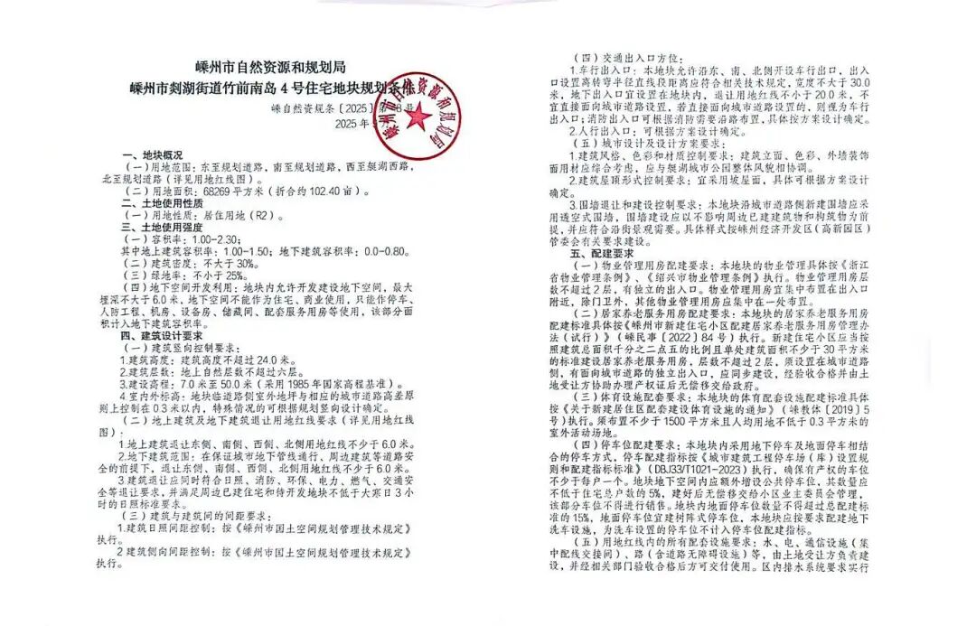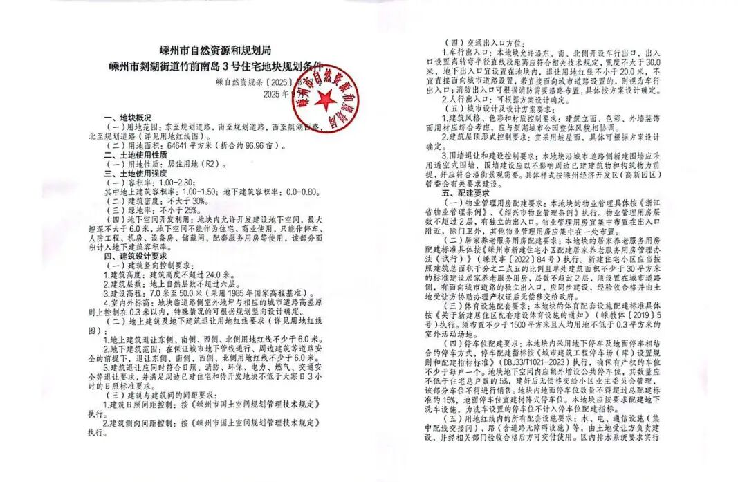 經(jīng)嵊州市人民政府批準,嵊州市自然資源和規(guī)劃局決定于2025年10月10日上午10時00分,以網(wǎng)上拍賣方式公開出讓嵊州市剡湖街道竹前南島3號、4號住宅地塊國有建設(shè)用地使用權(quán)?,F(xiàn)將有關(guān)事項公告如下: