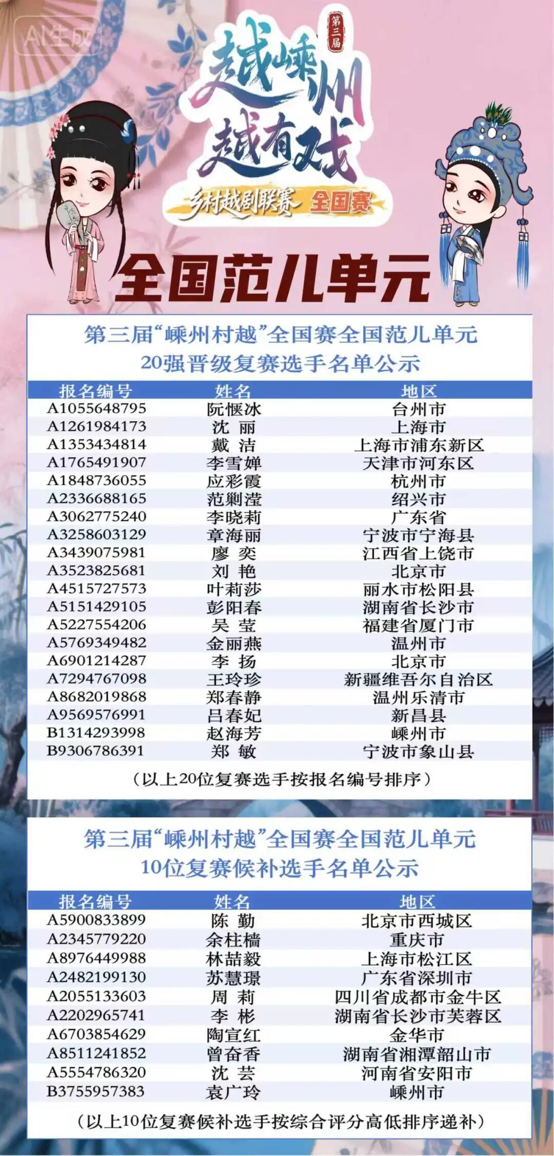 其中,前20強為晉級復(fù)賽的正式選手,將通過抽簽分成A、B兩組,于近期分批赴越劇誕生地嵊州,以研學(xué)“唱游”的綜藝形式參加現(xiàn)場復(fù)賽。另外10名選手為復(fù)賽候補選手,如復(fù)賽選手由于特殊原因無法參加比賽,其復(fù)賽資格將由復(fù)賽候補選手根據(jù)綜合排名前后依次遞補。