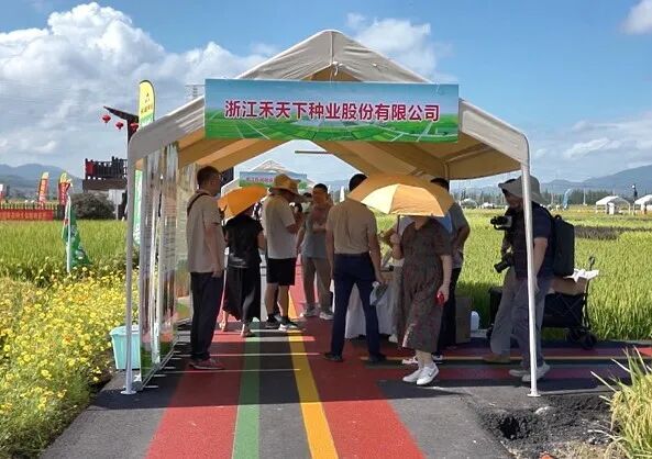 走進繁育場,一片片稻田郁郁蔥蔥,不同品種水稻長勢喜人。在專用稻展示區(qū),浙江禾天下種業(yè)的展區(qū)被圍得水泄不通,工作人員忙著介紹新品種。