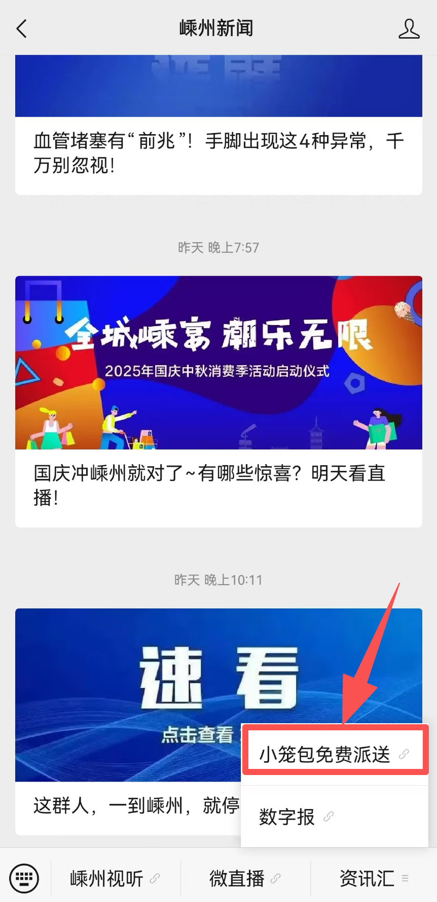 ②點(diǎn)擊“嵊州新聞”微信公眾號底部菜單欄“資訊匯”,點(diǎn)擊“小籠包免費(fèi)派送”進(jìn)行搶券。