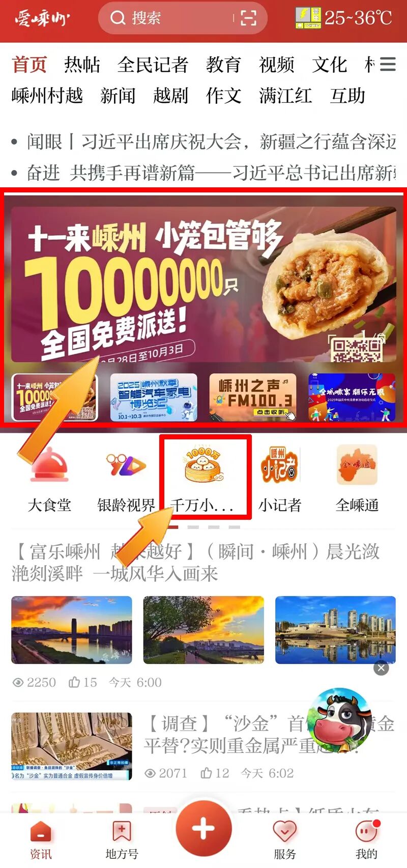 ①掃一掃下方二維碼,進(jìn)入“愛嵊州”APP,在“10000000只小籠包免費(fèi)送活動”頁面進(jìn)行搶券。