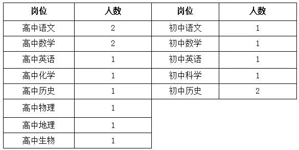 本次招聘高中各學(xué)科共計(jì)劃崗位數(shù)10名、初中各學(xué)科共計(jì)劃崗位數(shù)6名: