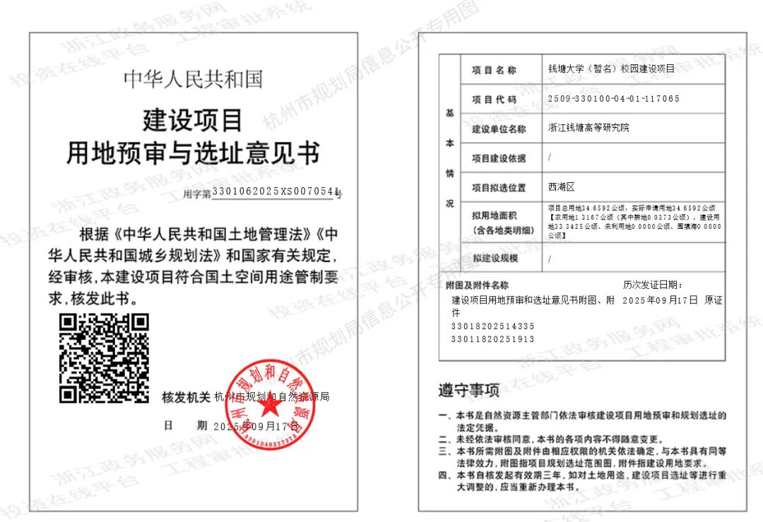 同年6月,杭州市行政審批服務(wù)管理辦公室網(wǎng)站刊發(fā)一則由杭州市規(guī)劃和自然資源局供稿的文章《錢塘大學(xué)獲批!為高等教育發(fā)展注入強(qiáng)勁動(dòng)力》顯示,錢塘大學(xué)用地已于5月17日獲得省政府批準(zhǔn),為錢塘大學(xué)落地建設(shè)筑牢了土地要素根基。