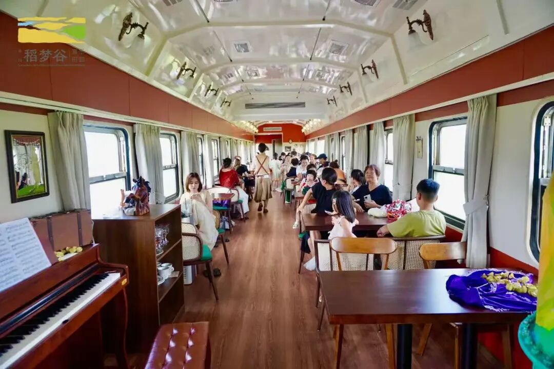 一大早,稻夢谷已經(jīng)游客如織。??吭诘咎镩g的綠皮火車,在陽光映照下別有一番韻味,吸引了眾多游客駐足圍觀、拍照留念。這列退役的綠皮火車,經(jīng)改造后分設(shè)車頭和6節(jié)車廂,已成為稻夢谷的標志性景觀。為了讓游客重溫老時光,這列綠皮火車還集成了餐飲、住宿、旅拍等功能,吸引了游客打卡體驗。