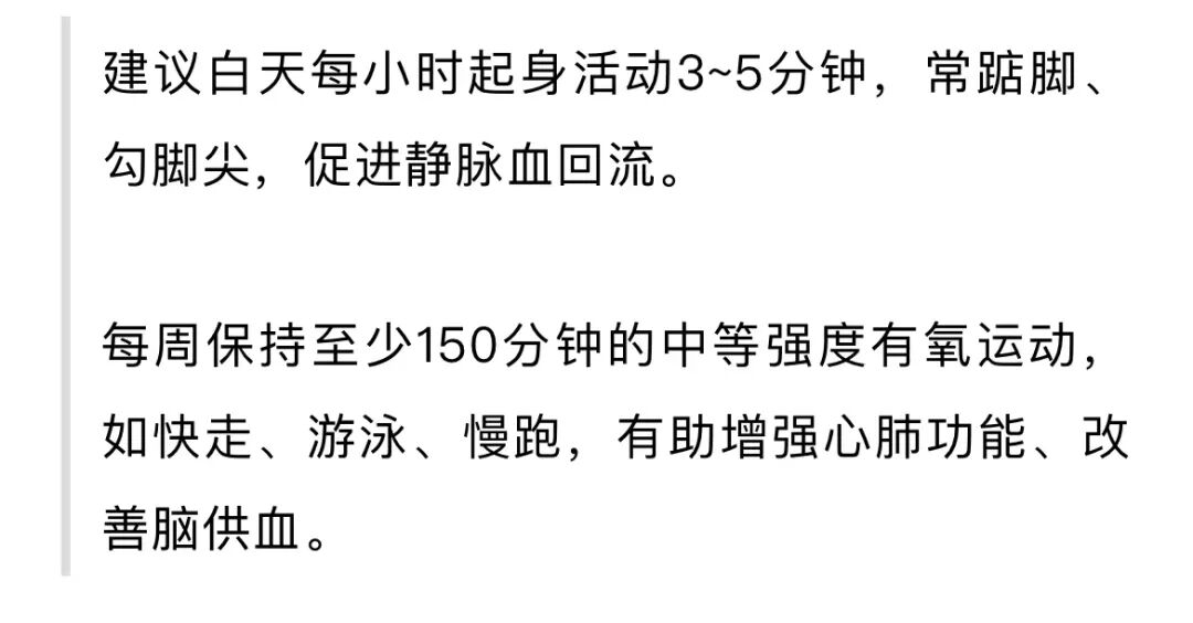 久坐會(huì)減慢血液循環(huán),增加血液黏度和血栓形成風(fēng)險(xiǎn)。既往研究顯示,每日靜坐超過(guò)8小時(shí)的人,腦梗發(fā)生風(fēng)險(xiǎn)可升高20%。