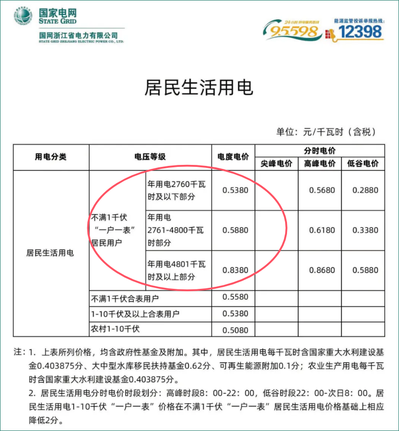浙江省居民生活用電階梯電價(jià)分檔電量及加價(jià)標(biāo)準(zhǔn)如下↓