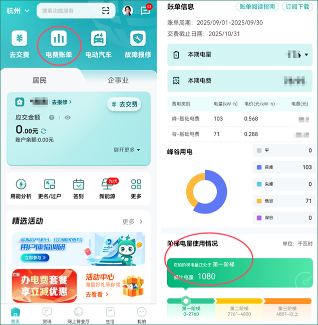 打開網(wǎng)上國網(wǎng)App(沒注冊(cè)的小伙伴記得先注冊(cè)、登錄和綁定戶號(hào)),首頁點(diǎn)擊【電費(fèi)賬單】,不僅能查看月度電費(fèi)、電量,階梯電量用到哪一檔了也能一目了然,足不出戶就能輕松掌握用電動(dòng)態(tài)。
