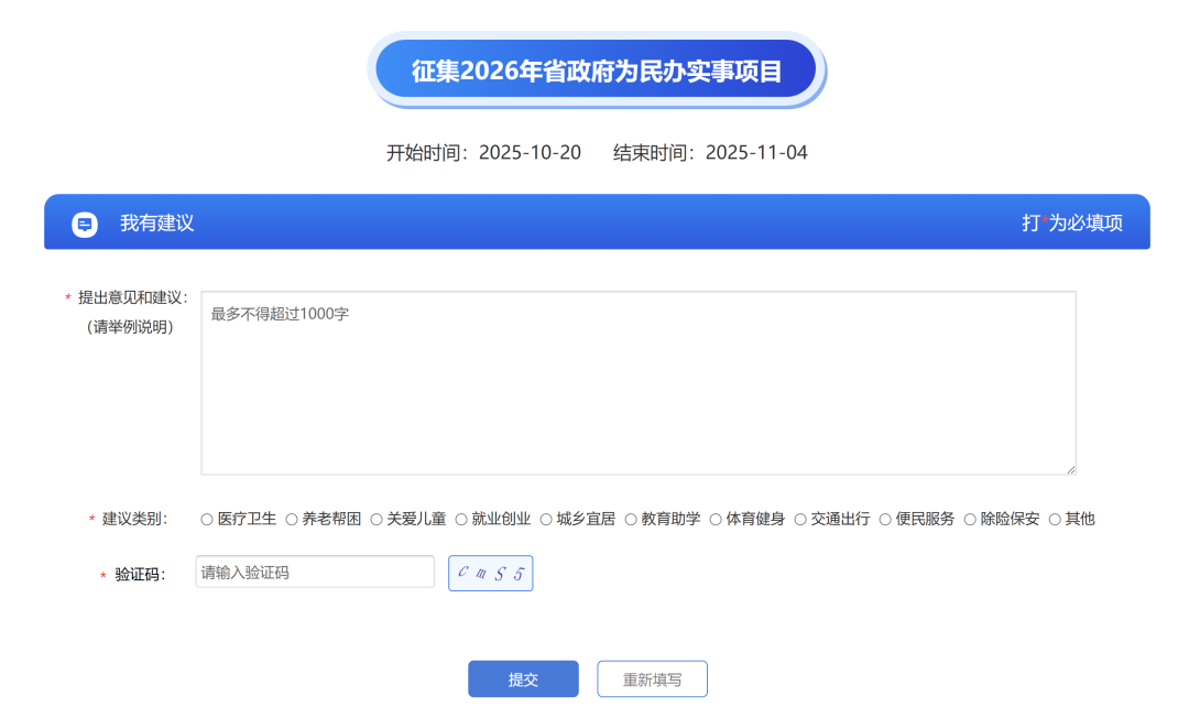 為更好地謀實(shí)謀好2026年為民辦實(shí)事項(xiàng)目,我們繼續(xù)通過互聯(lián)網(wǎng)向社會(huì)各界廣泛征集意見建議。請(qǐng)大家踴躍參與,提出你們最關(guān)心、最希望政府辦好的民生實(shí)事。省政府一定認(rèn)真研究、充分吸納大家的意見建議,精心謀劃候選項(xiàng)目,并在提交省人民代表大會(huì)審議確定后,科學(xué)組織實(shí)施,確保把每一件惠民生的事辦實(shí)、暖民心的事辦細(xì)、順民意的事辦好,讓高質(zhì)量發(fā)展建設(shè)共同富裕示范區(qū)的民生成色更足、幸福底色更亮。