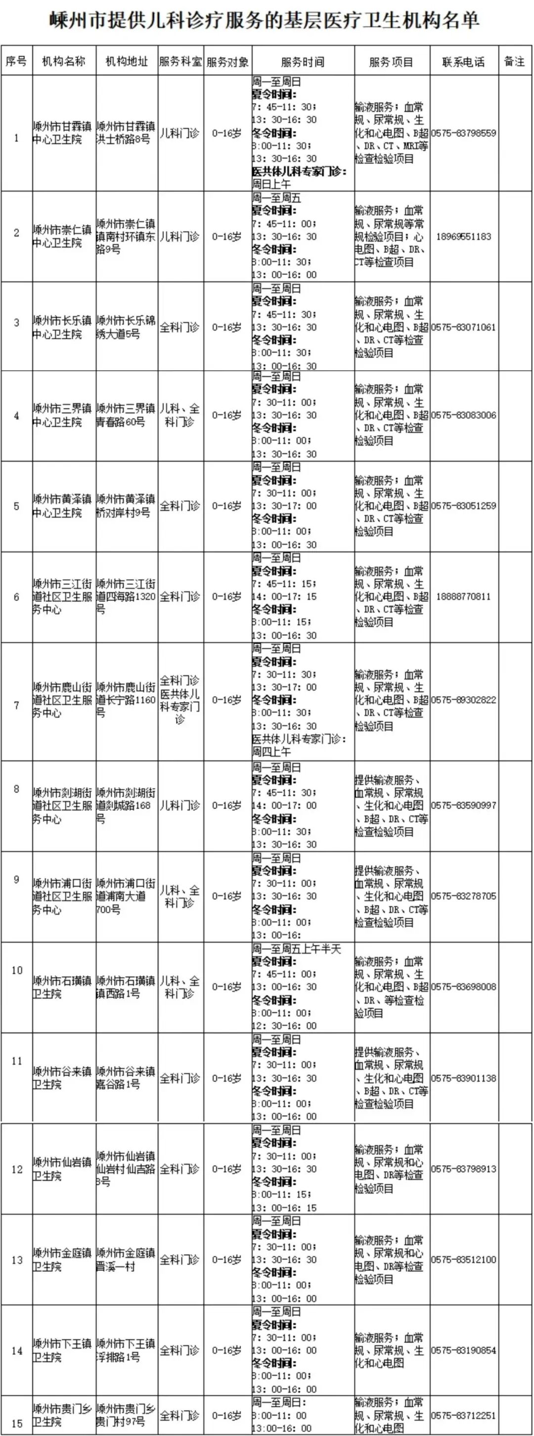 為進一步優(yōu)化我市兒科醫(yī)療服務資源供給,方便廣大市民尤其是嬰幼兒家長快速獲取就近的兒科診療信息,切實保障兒童身體健康和生命安全,現(xiàn)將嵊州市提供兒科診療服務的基層醫(yī)療衛(wèi)生機構名單予以公示。
