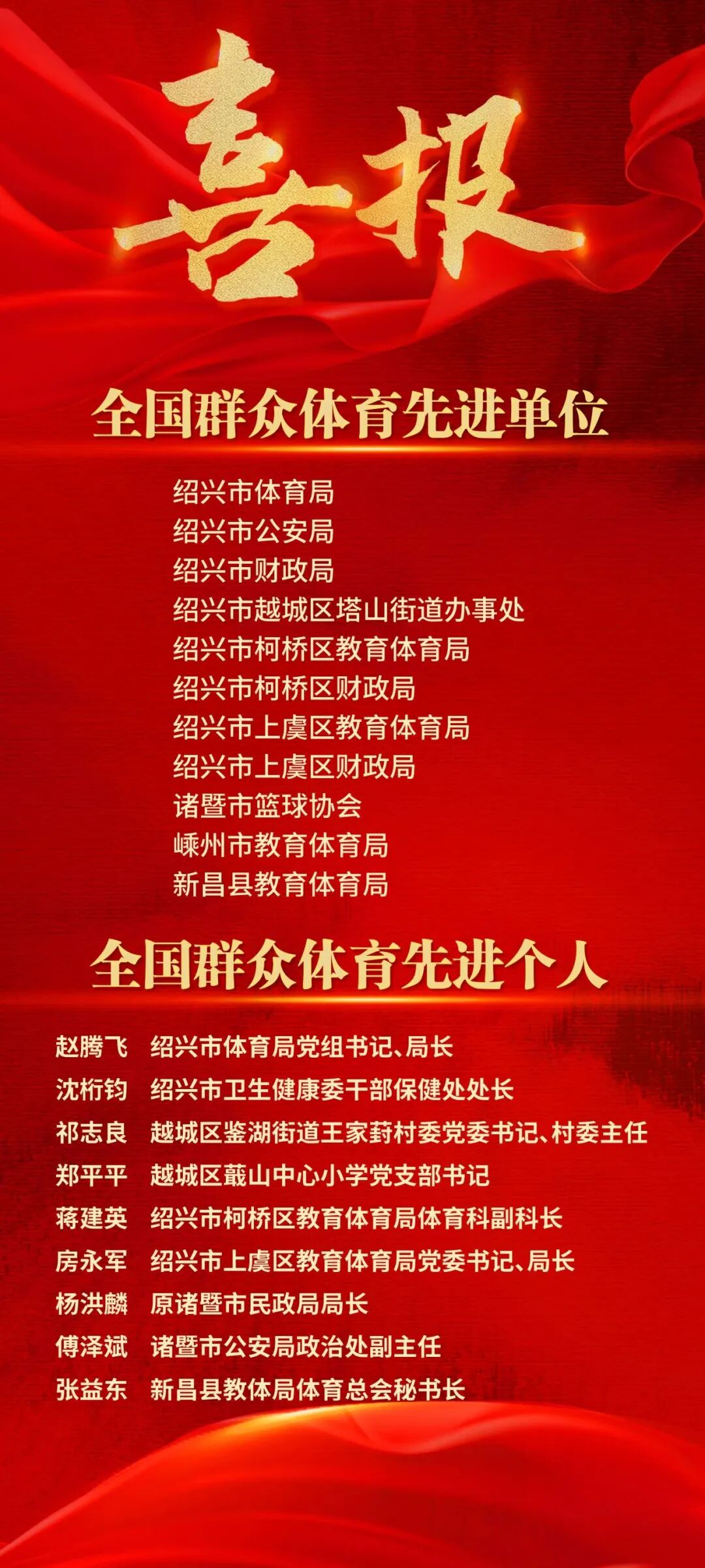 11月9日晚,中華人民共和國第十五屆運動會開幕式在廣東奧林匹克體育中心隆重舉行。開幕前夕,國家體育總局對2021—2024年度全國群眾體育先進(jìn)單位和先進(jìn)個人進(jìn)行表彰。其中,紹興市體育局、公安局、財政局等11個集體,趙騰飛、沈桁鈞等9人獲全國群眾體育先進(jìn)單位、先進(jìn)個人榮譽。