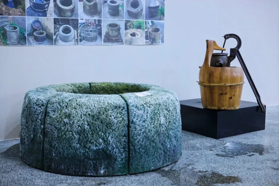 展覽的開篇,極具視覺沖擊力。布滿青苔的水井、銹跡斑駁的打水器、鐵皮桶,與墻上村民挑水護(hù)苗、輸水車緊急抽水、島民四處買水的老照片相互映襯,瞬間將人們拉回到二十年前的浙江農(nóng)村。