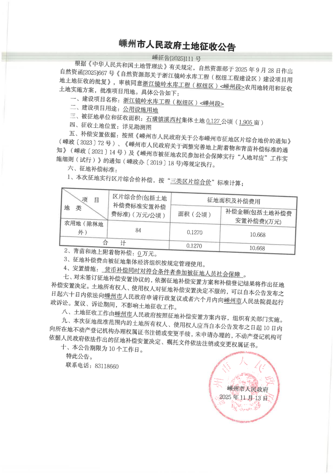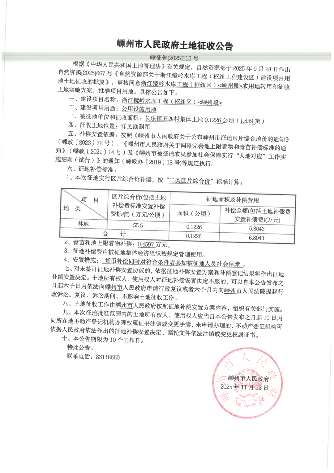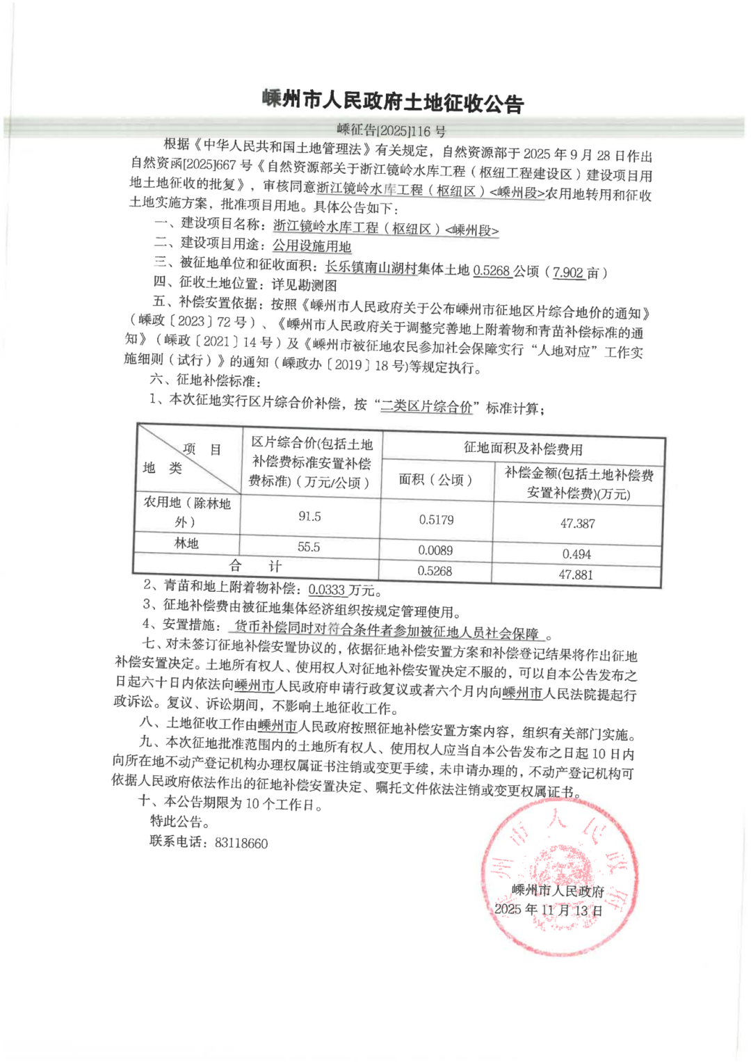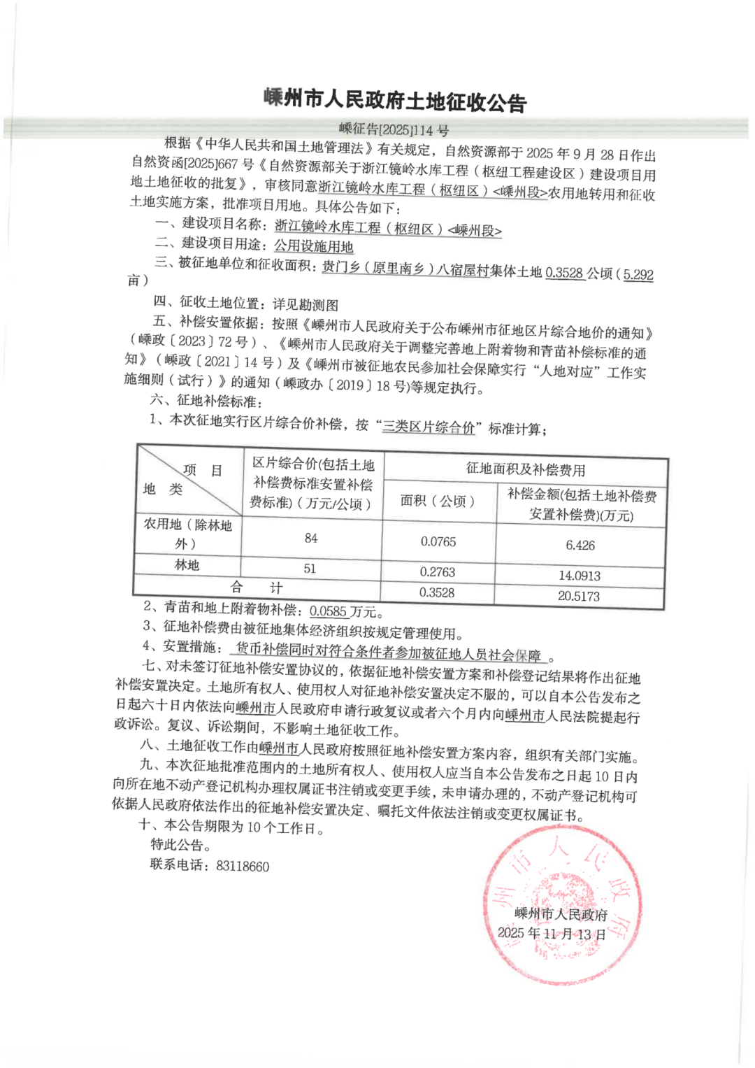 近日,嵊州市人民政府網(wǎng)站發(fā)布一大波鏡嶺水庫(kù)工程土地征收公告,涉及崇仁鎮(zhèn)富西新村,石璜鎮(zhèn)樓家村、溪西村,谷來鎮(zhèn)護(hù)國(guó)嶺村、谷來二村,貴門鄉(xiāng)(原里南鄉(xiāng))八宿屋村,長(zhǎng)樂鎮(zhèn)五四村、南山湖村、山口村、沃基村、留公田村、石砩村、西白村、長(zhǎng)樂二三村,相關(guān)公告如下: