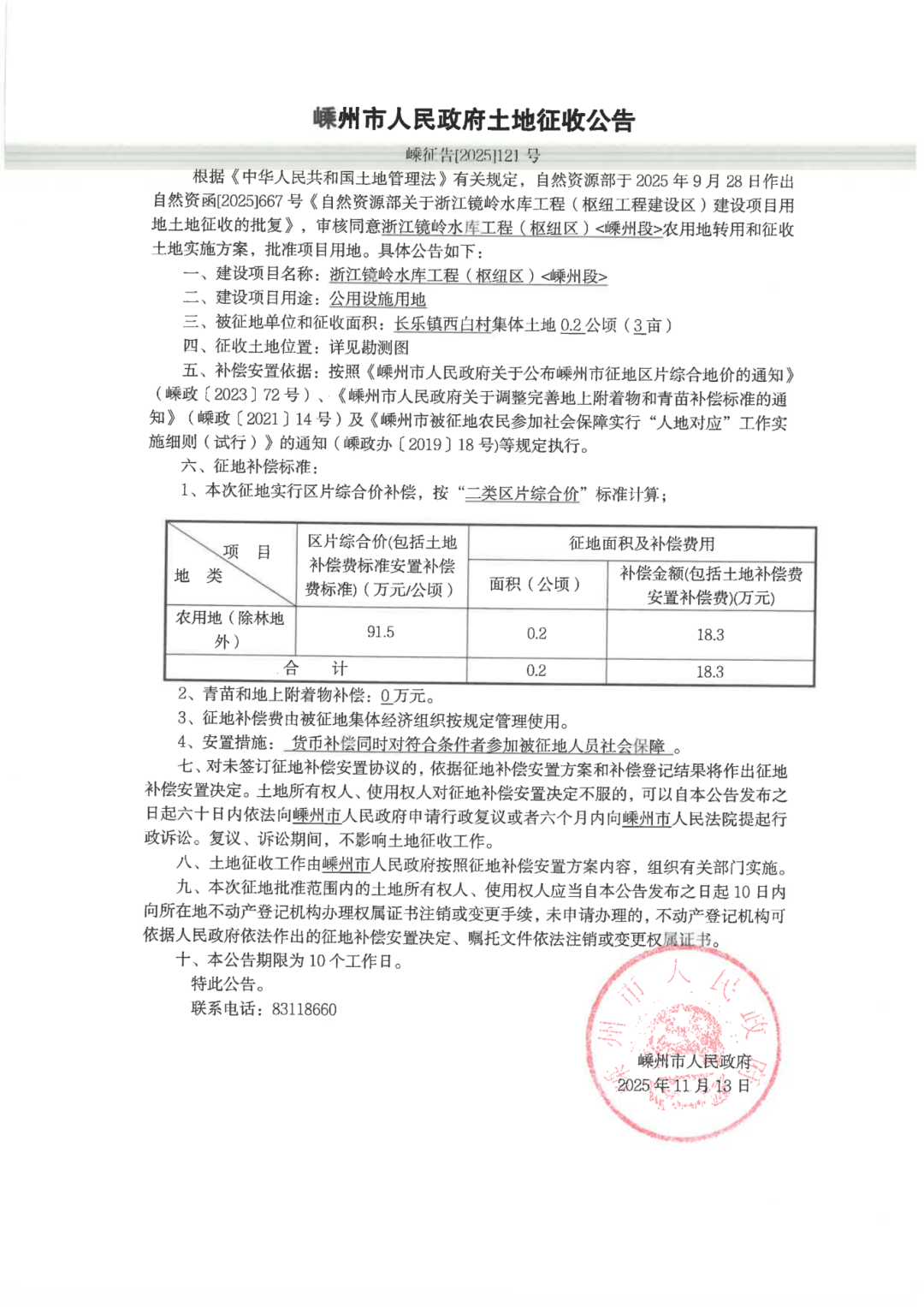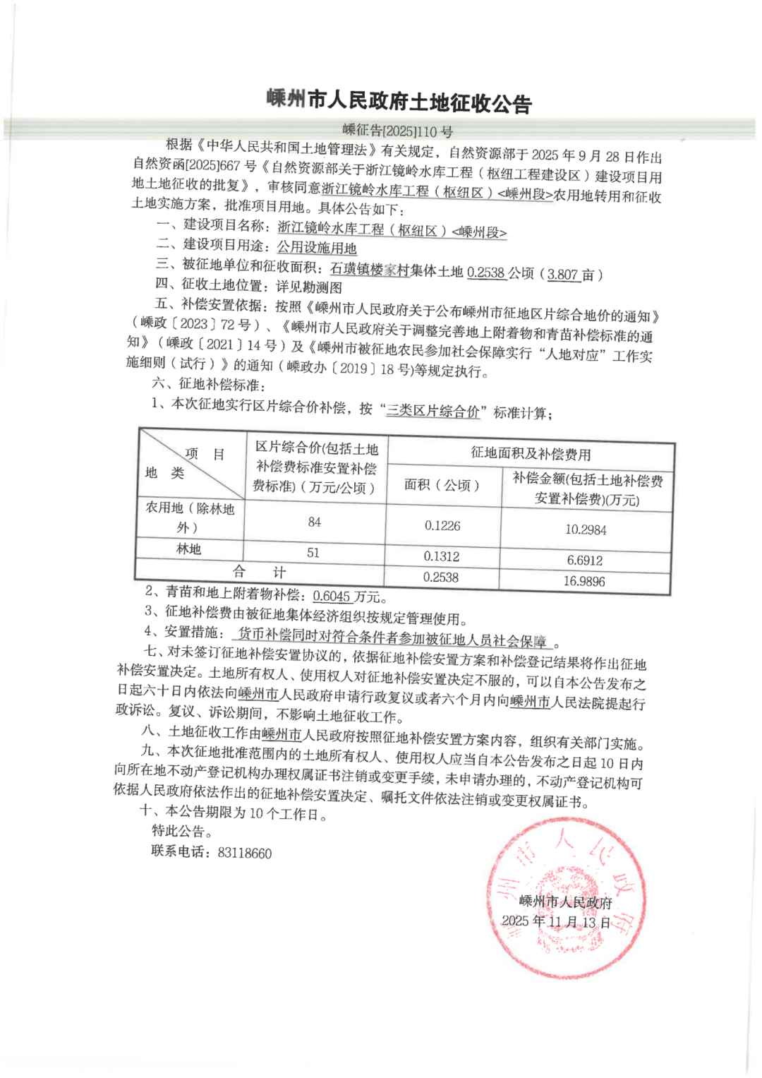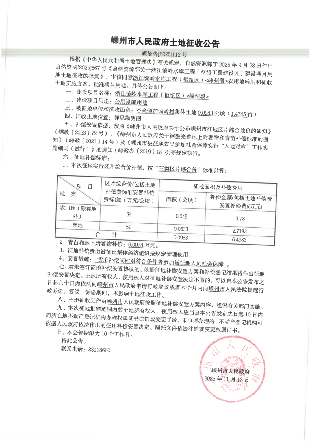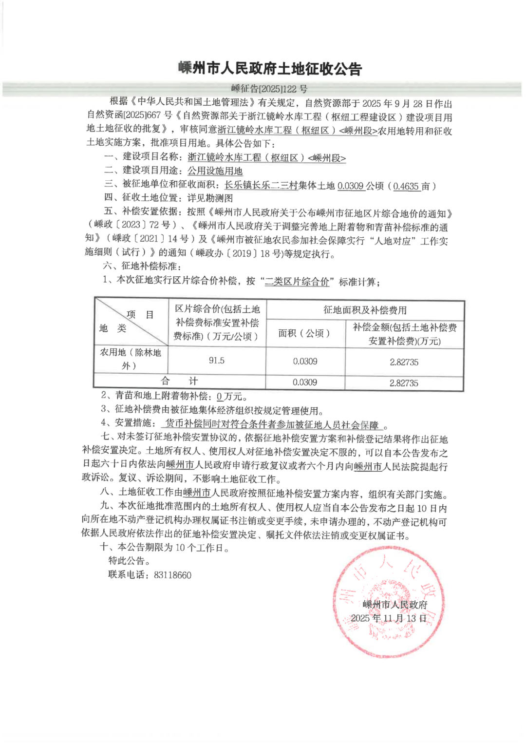 近日,嵊州市人民政府網(wǎng)站發(fā)布一大波鏡嶺水庫(kù)工程土地征收公告,涉及崇仁鎮(zhèn)富西新村,石璜鎮(zhèn)樓家村、溪西村,谷來鎮(zhèn)護(hù)國(guó)嶺村、谷來二村,貴門鄉(xiāng)(原里南鄉(xiāng))八宿屋村,長(zhǎng)樂鎮(zhèn)五四村、南山湖村、山口村、沃基村、留公田村、石砩村、西白村、長(zhǎng)樂二三村,相關(guān)公告如下: