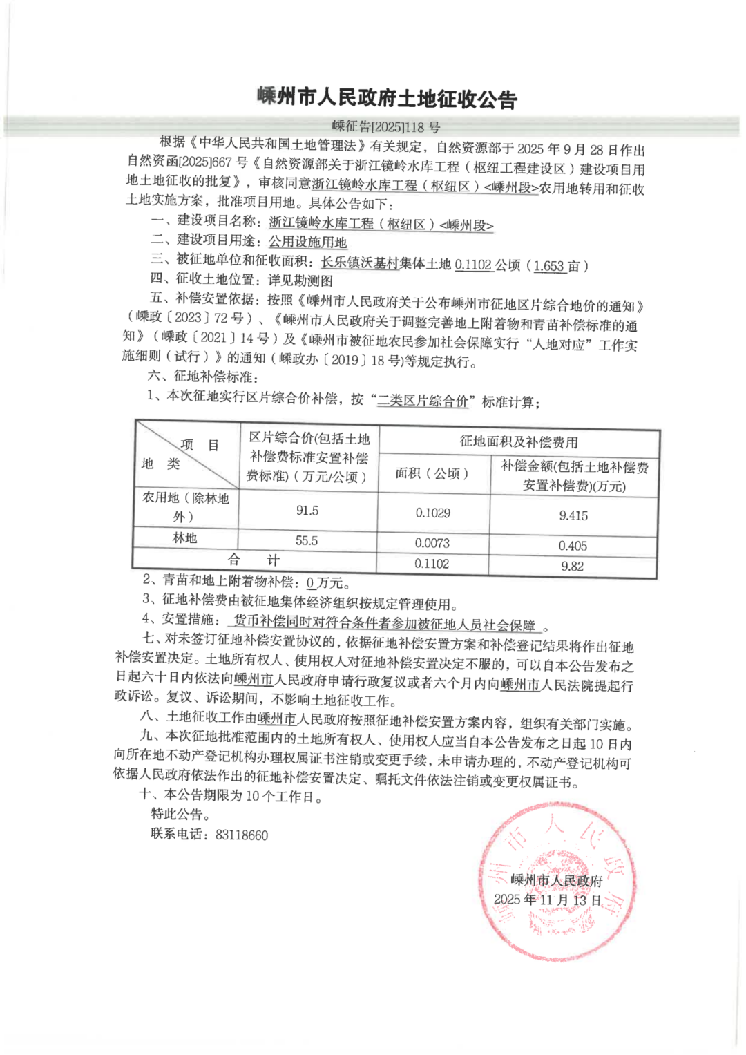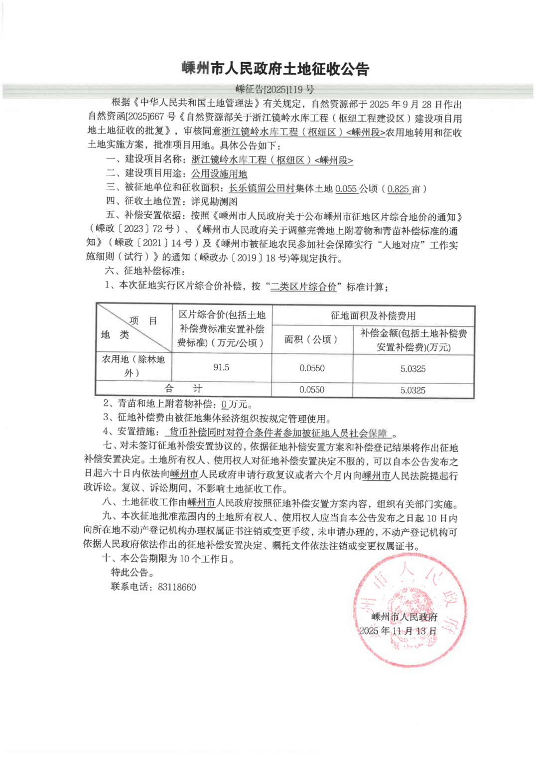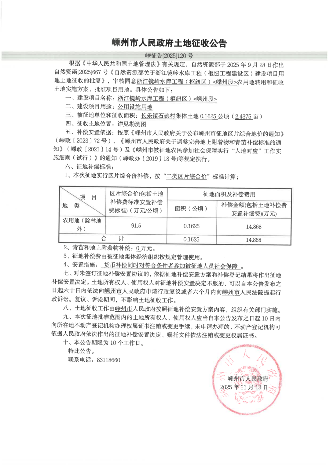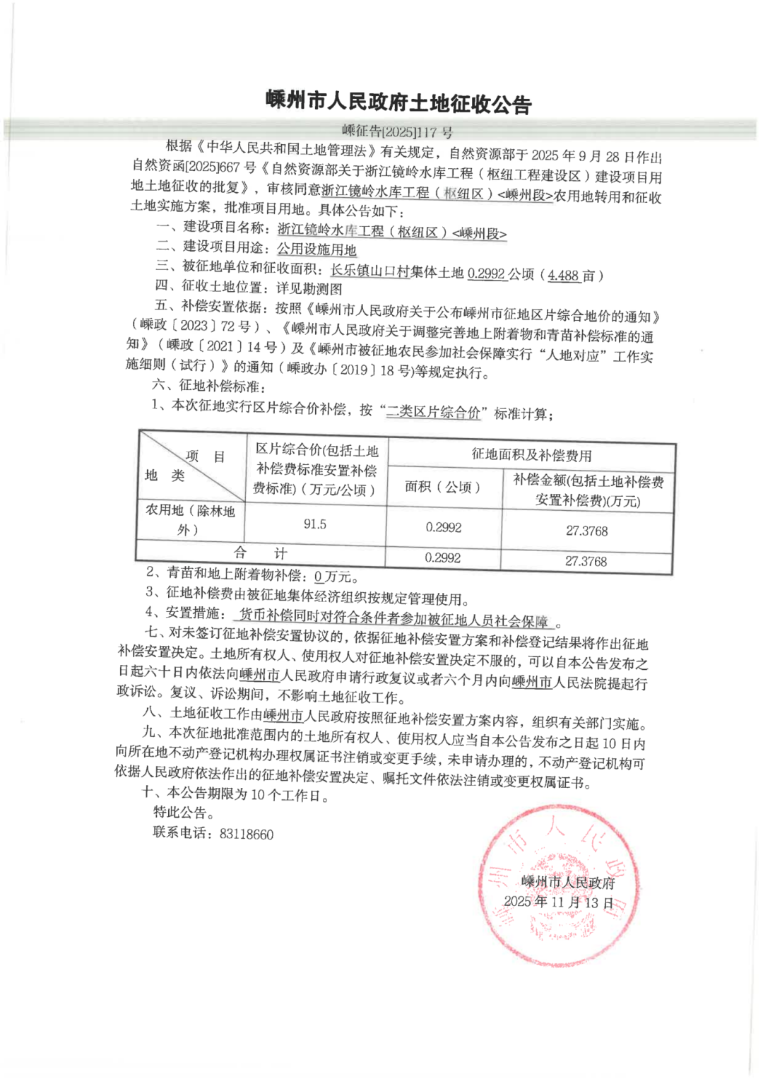 近日,嵊州市人民政府網(wǎng)站發(fā)布一大波鏡嶺水庫(kù)工程土地征收公告,涉及崇仁鎮(zhèn)富西新村,石璜鎮(zhèn)樓家村、溪西村,谷來鎮(zhèn)護(hù)國(guó)嶺村、谷來二村,貴門鄉(xiāng)(原里南鄉(xiāng))八宿屋村,長(zhǎng)樂鎮(zhèn)五四村、南山湖村、山口村、沃基村、留公田村、石砩村、西白村、長(zhǎng)樂二三村,相關(guān)公告如下: