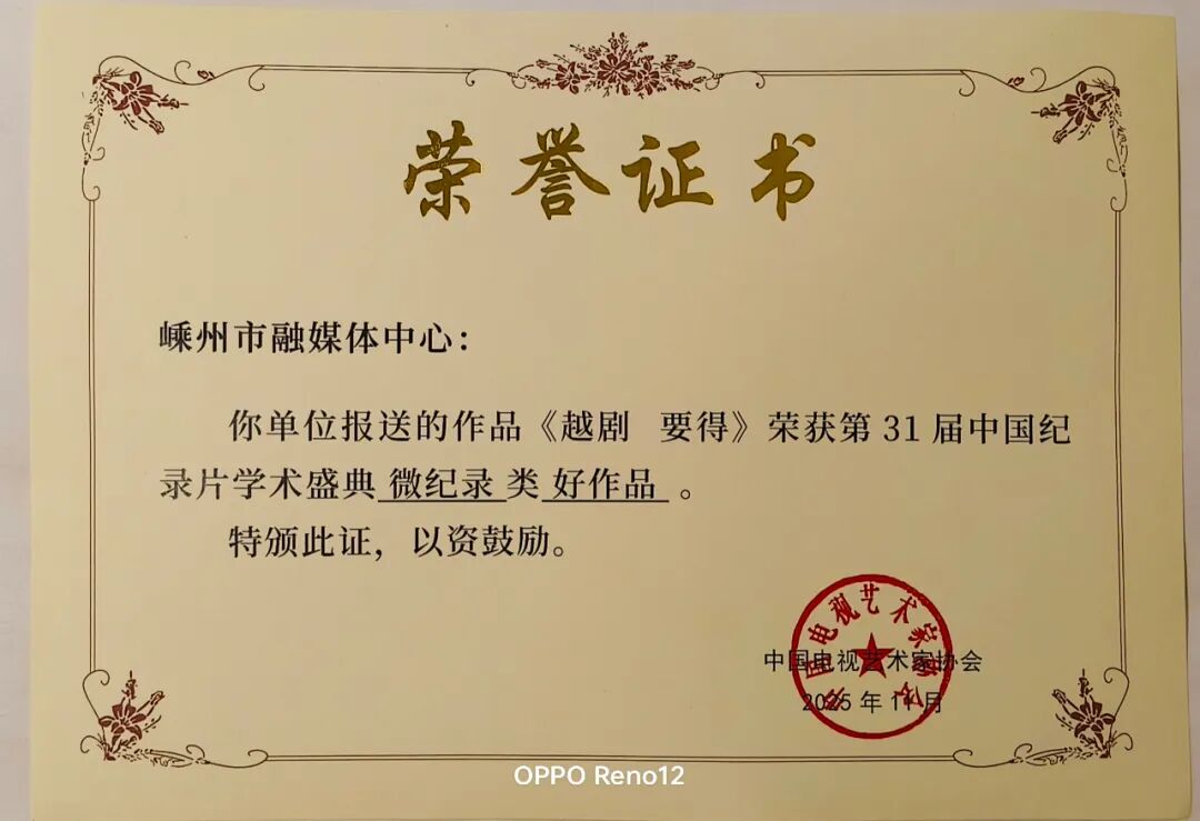 今天,第31屆中國紀錄片學術盛典傳來消息,嵊州市融媒體中心出品的紀錄片《越劇 要得》獲得好作品獎。此前,該片已獲得第九屆(2024年度)浙江省紀錄片最高獎“丹桂獎”。