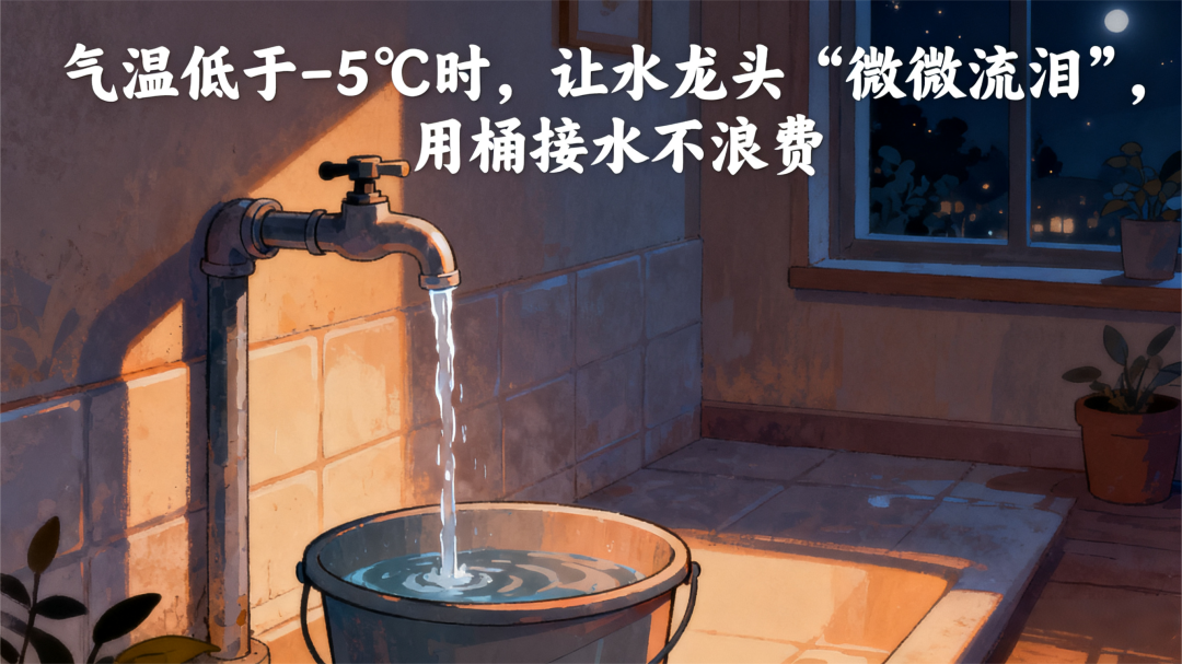 當(dāng)夜晚氣溫低于-5℃時,不妨讓水龍頭“微微流淚”,保持一線細(xì)流,就能有效防凍。記得用桶接水,不浪費(fèi)每一滴珍貴的水資源。