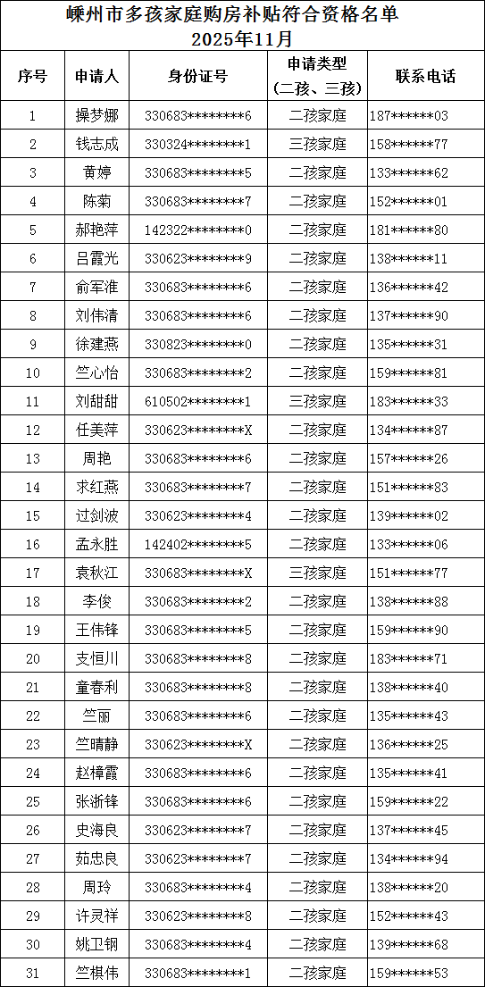 根據(jù)《嵊州市多孩家庭購房補(bǔ)貼實(shí)施細(xì)則》文件精神,2025年10月26日至2025年11月25日,通過審核符合資格多孩家庭共31戶,當(dāng)前剩余補(bǔ)貼額度1741.8695萬元,現(xiàn)將名單進(jìn)行公布。