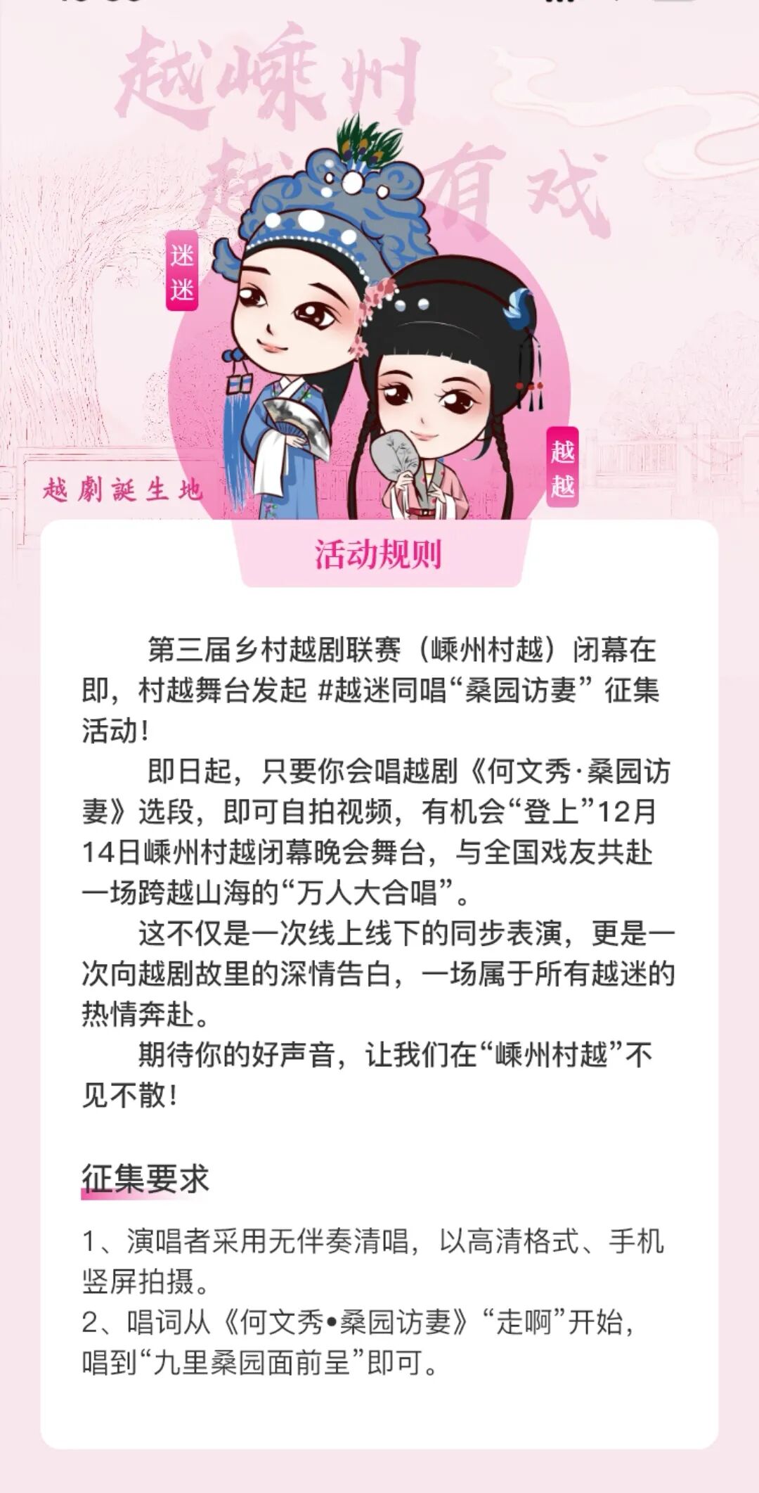 即日起,只要你會(huì)唱越劇《何文秀·桑園訪妻》選段,即可自拍視頻,有機(jī)會(huì)“登上”12月14日嵊州村越閉幕晚會(huì)舞臺(tái),與全國(guó)戲友共赴一場(chǎng)跨越山海的“萬(wàn)人大合唱”。