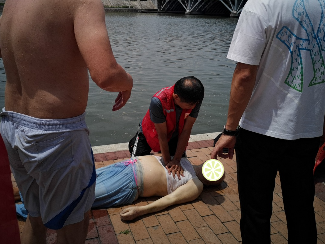 5月22日中午,東橋水域發(fā)生驚險(xiǎn)一幕:一名市民不慎落水,生命垂危。接到任務(wù)后,市紅十字應(yīng)急救援隊(duì)火速響應(yīng)、趕往現(xiàn)場(chǎng)。作為水上救援隊(duì)副隊(duì)長(zhǎng),嚴(yán)峰沖鋒在前,與隊(duì)友合力將已失去意識(shí)的溺水者救上岸,并持續(xù)實(shí)施心肺復(fù)蘇,直至120急救車抵達(dá)。