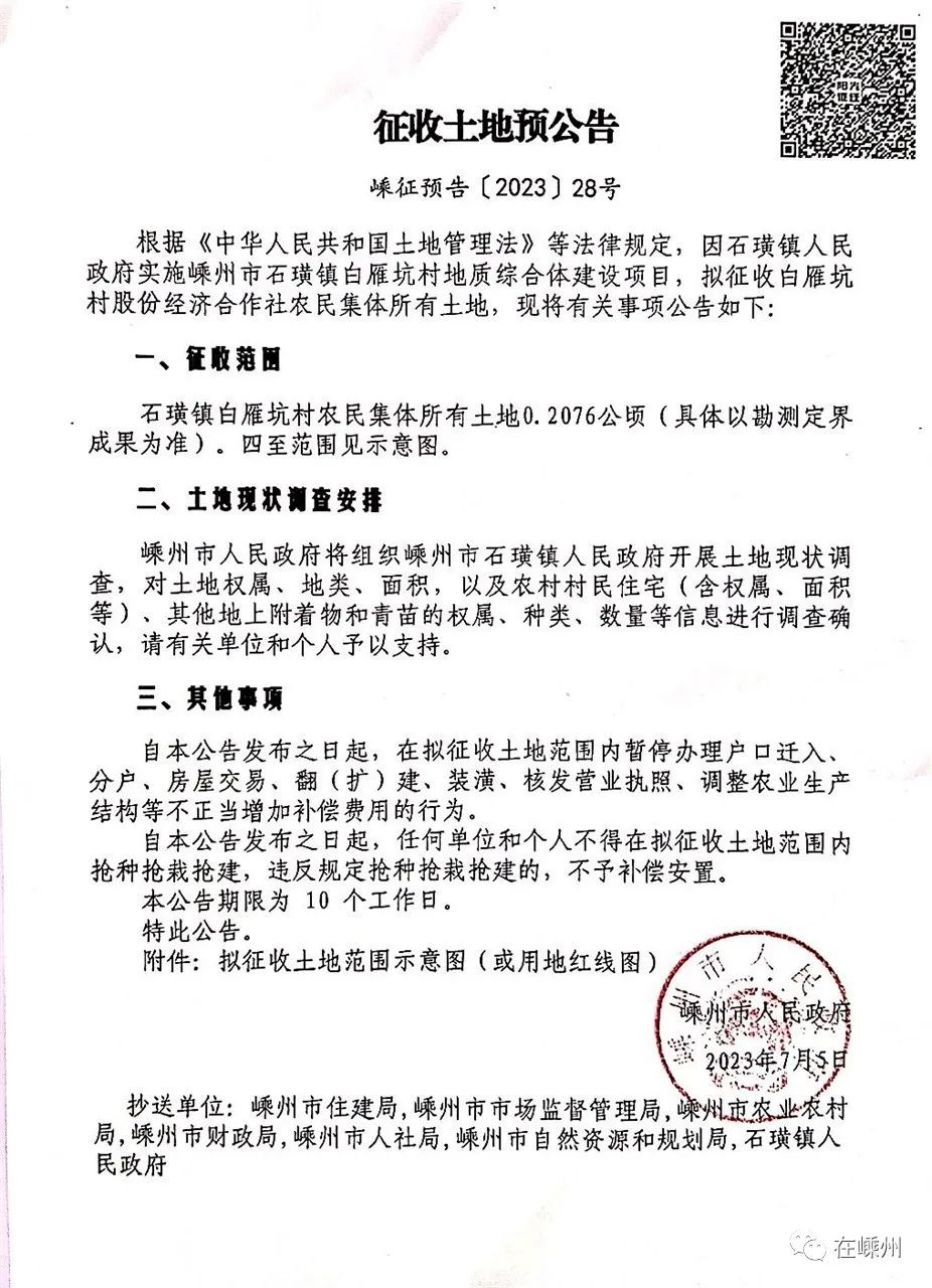 為切實(shí)履行公眾參與、信息公開(kāi)程序,根據(jù)《嵊州市重大決策社會(huì)風(fēng)險(xiǎn)評(píng)估實(shí)施細(xì)則》(嵊市委辦發(fā)〔2020〕17號(hào))文件要求,現(xiàn)將嵊州市石璜鎮(zhèn)白雁坑村地質(zhì)綜合體建設(shè)項(xiàng)目土地征收的有關(guān)情況公告如下:一、項(xiàng)目名稱