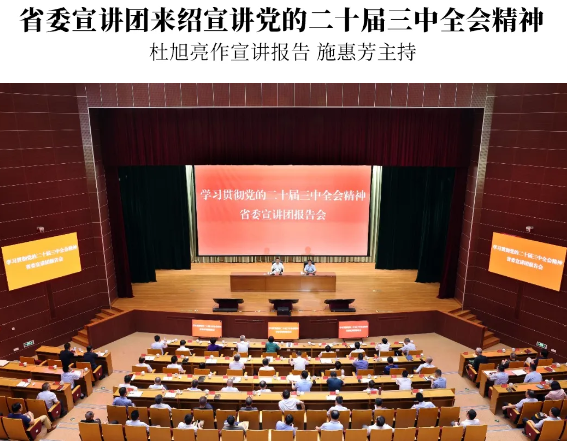 根據(jù)省委統(tǒng)一安排,今天下午,學(xué)習(xí)貫徹黨的二十屆三中全會精神省委宣講團(tuán)報告會在紹興市舉行。省委宣講團(tuán)成員,省發(fā)展改革委黨組書記、主任杜旭亮作宣講報告。紹興市委書記施惠芳主持報告會,紹興市領(lǐng)導(dǎo)吳登芬、譚志