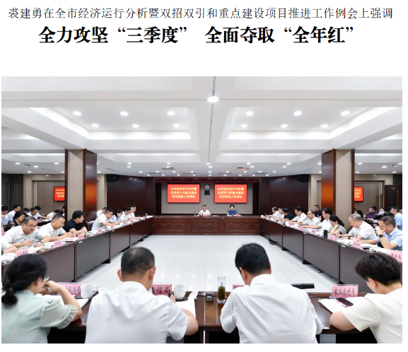 8月29下午,市委書記裘建勇主持召開全市經(jīng)濟(jì)運(yùn)行分析暨雙招雙引和重點(diǎn)建設(shè)項(xiàng)目推進(jìn)工作例會。他強(qiáng)調(diào),要深入學(xué)習(xí)貫徹黨的二十屆三中全會精神,朝著目標(biāo)篤定前行,增強(qiáng)信心乘勢而上,全力攻堅(jiān)“三季度”,全面奪取