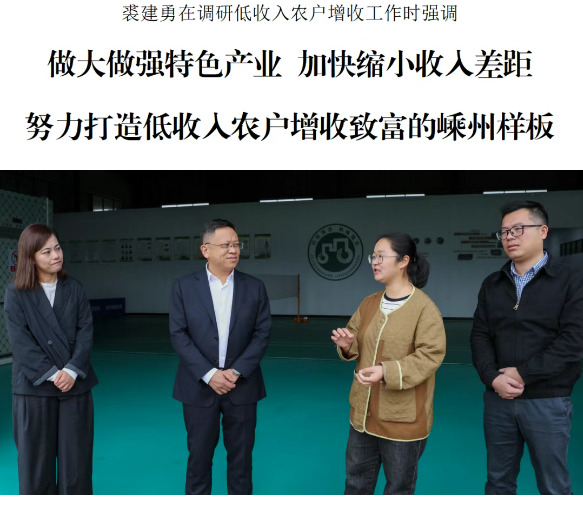 10月30日上午,市委書記裘建勇赴我市部分鄉(xiāng)鎮(zhèn),就低收入農(nóng)戶增收工作進(jìn)行專題調(diào)研。他強(qiáng)調(diào),要深入學(xué)習(xí)貫徹習(xí)近平總書記關(guān)于共同富裕、“千萬工程”的重要論述,堅(jiān)持以“千萬工程”為牽引,不斷做大做強(qiáng)特色產(chǎn)業(yè)
