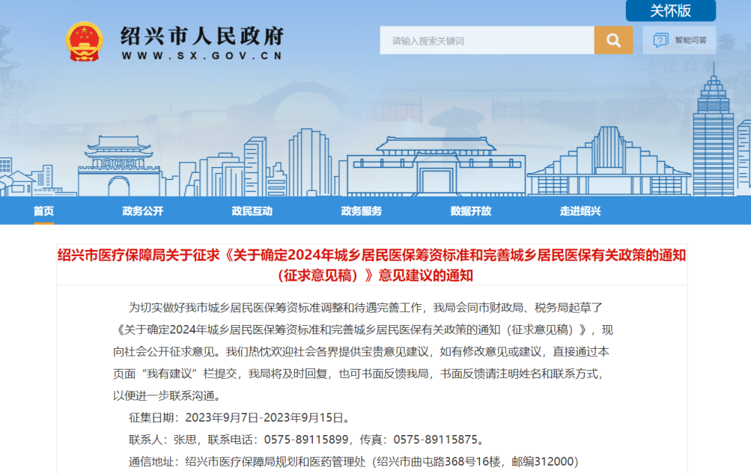 9月7日,紹興市人民政府網(wǎng)發(fā)布一則紹興市醫(yī)療保障局關于征求《關于確定2024年城鄉(xiāng)居民醫(yī)保籌資標準和完善城鄉(xiāng)居民醫(yī)保有關政策的通知(征求意見稿)》意見建議的通知。關于確定2024年城鄉(xiāng)居民醫(yī)?;I資標準
