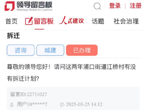 近日,有“用戶10*****7”在人民網(wǎng)領(lǐng)導(dǎo)留言板里提問(wèn),這兩年浦口街道江橋村有沒(méi)有拆遷計(jì)劃?對(duì)此,嵊州市浦口街道辦事處答復(fù),江橋村現(xiàn)無(wú)拆遷計(jì)劃。來(lái)源:人民網(wǎng)
