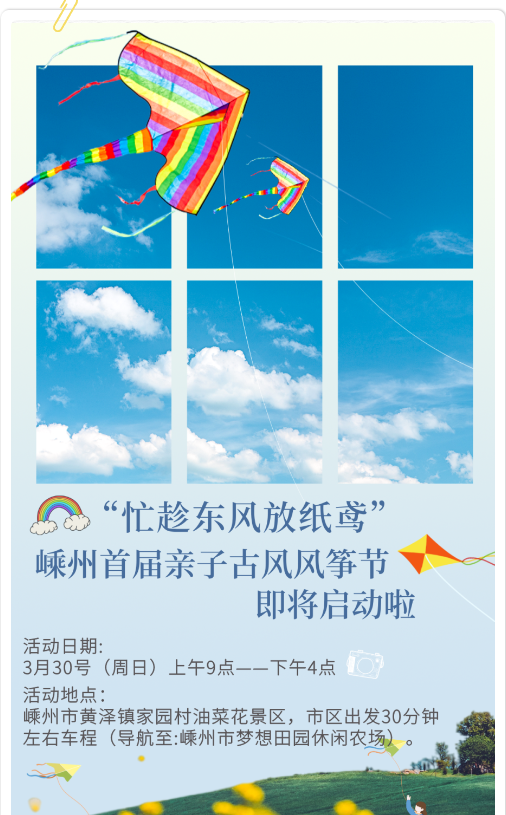 一、活動主題“忙趁東風放紙鳶”親子古風風箏節(jié)二、活動目的旨在弘揚傳統(tǒng)文化,激活鄉(xiāng)村旅游,增進親子關(guān)系,豐富市民文化生活。三、活動時間活動日期:3月30號(周日)上午9點——下午4點四、活動地點嵊州市黃