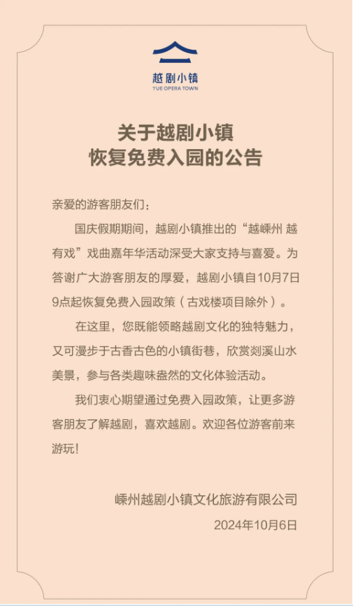 關(guān)于越劇小鎮(zhèn)恢復(fù)免費入園的公告