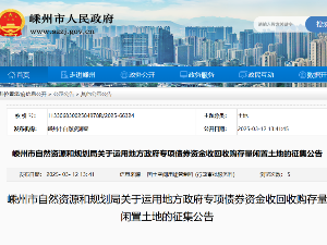 近日,嵊州市人民政府網(wǎng)站發(fā)布了《嵊州市自然資源和規(guī)劃局關(guān)于運(yùn)用地方政府專項債券資金收回收購存量閑置土地的征集公告》,也意味著嵊州專項債收購存量閑置土地工作即將開
