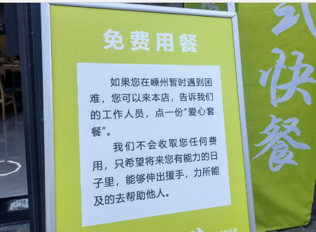 “如果您在嵊州暫時(shí)遇到困難,您可以來(lái)本店,告訴我們的工作人員,點(diǎn)一份“愛(ài)心套餐”。我們不會(huì)收取您任何費(fèi)用,只希望將來(lái)在您有能力的時(shí)候,能夠伸出援手,力所能及地幫助他人?!苯眨谡笮鲁菄?guó)際北面一家名