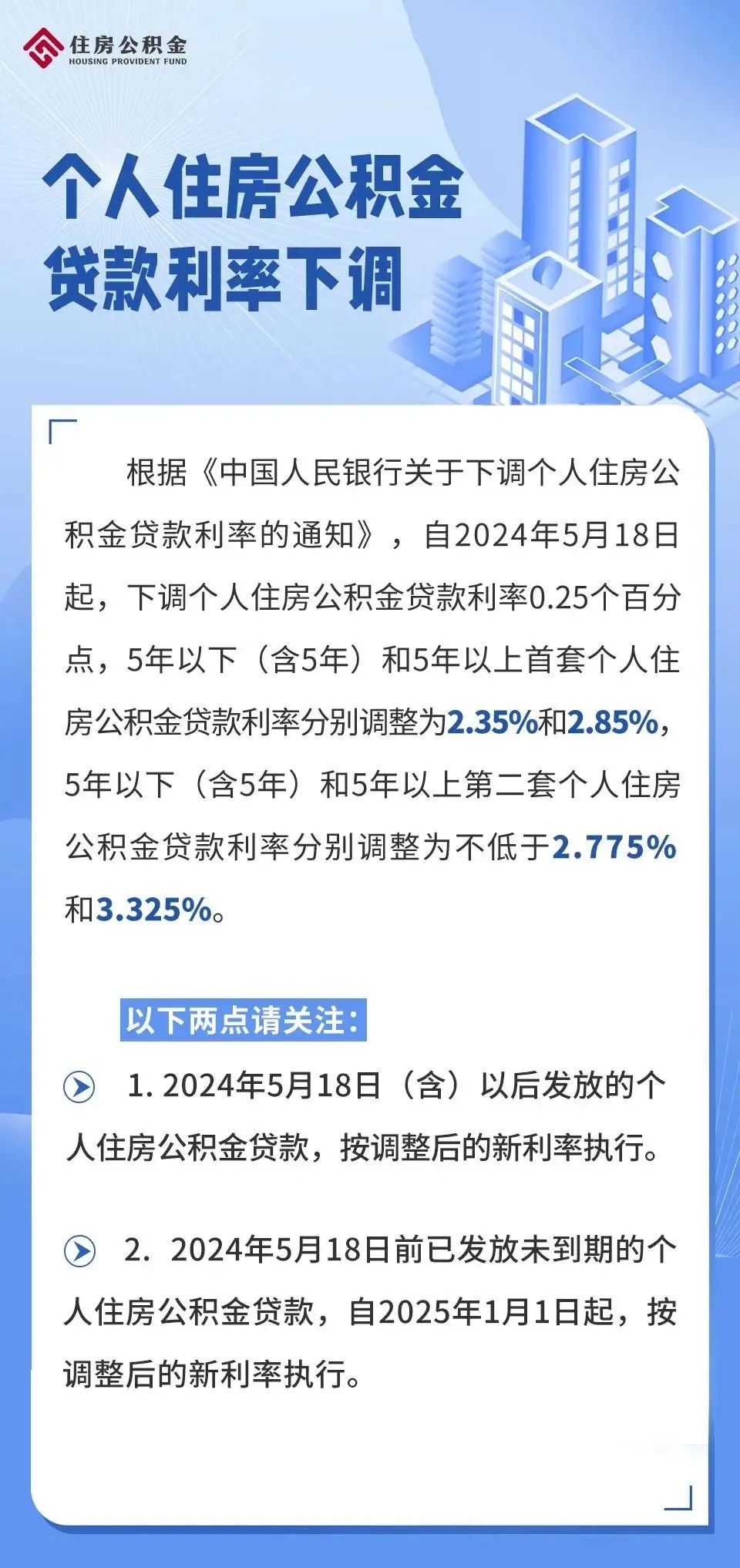 根據(jù)《中國人民銀行關(guān)于下調(diào)個人住房公積金貸款利率的通知》,明確自2025年5月8日起,下調(diào)個人住房公積金貸款利率0.25個百分點,5年以下(含5年)和5年以上首套個人住房公積金貸款利率分別下調(diào)至2.1